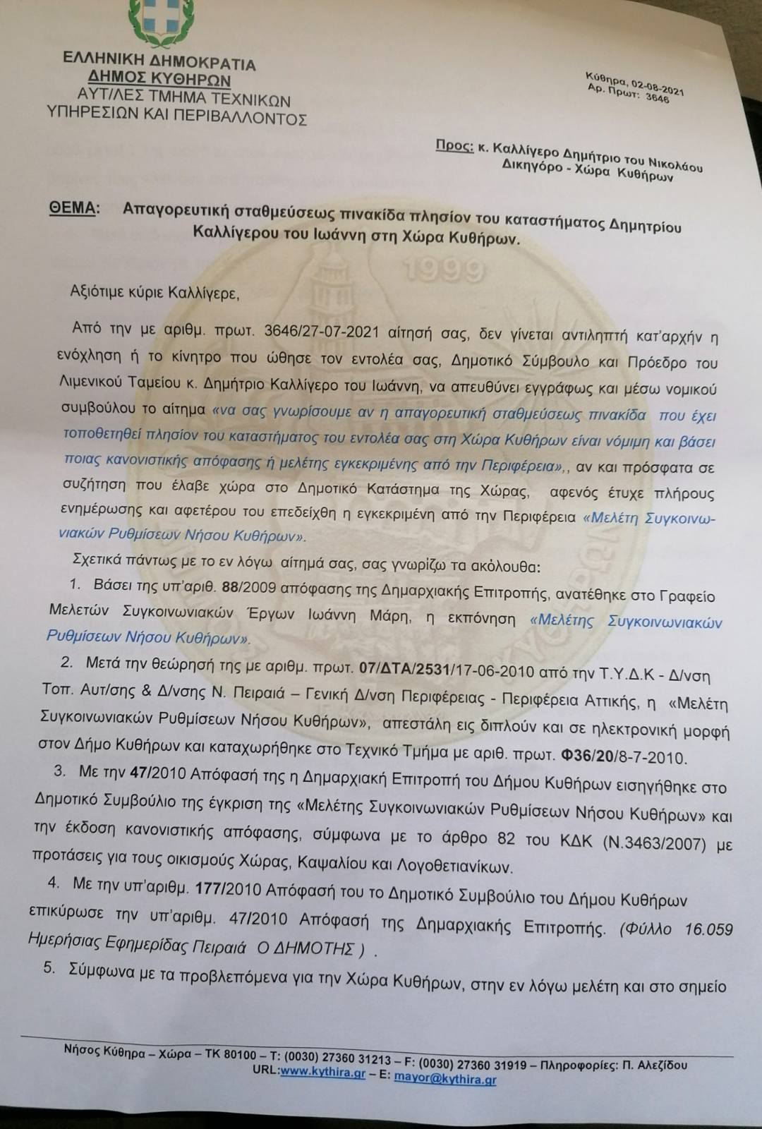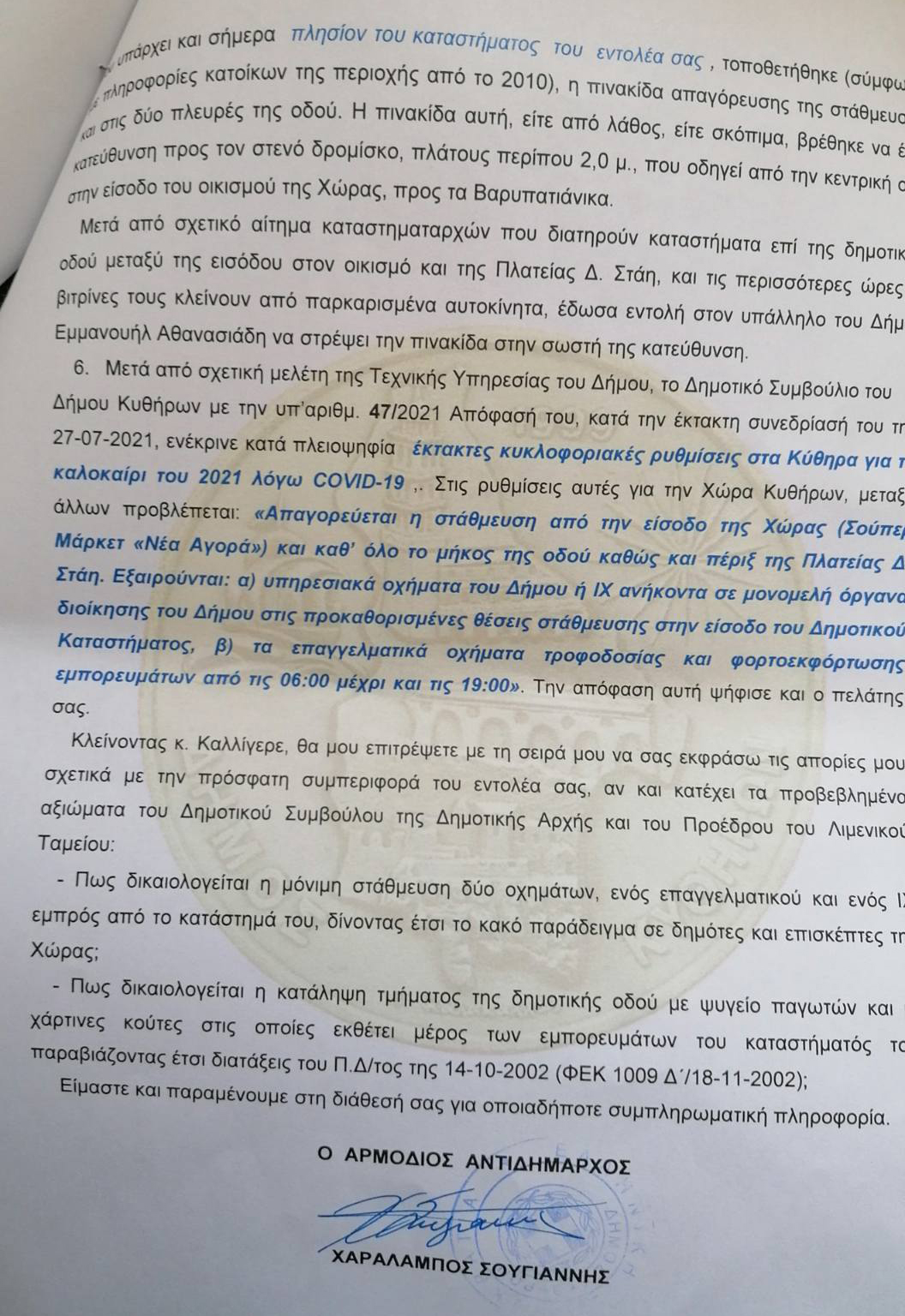 Για το τέλος όμως, θα θέλαμε να ρωτήσουμε και να μας απαντήσει ο κύριος Σουγιαννης για την αλληλογραφία που έχει μέσω δικηγόρου με έτερο πρωτοκλασάτο μέλος της παράταξης του (επισυνάπτεται σχετικό έγγραφο). Αλήθεια κύριε Σουγιαννη, εσείς που κόπτεστε για την νομιμότητα, τι μέτρα λάβατε για τις παραβάσεις που διαπιστώσατε και αναφέρετε στο συγκεκριμένο έγγραφο; Δεν είναι υποκριτικό όταν έχετε αναστατώσει όλη την Χώρα, τον Ιούλιο, για τα τραπεζάκια στην πλατεία να κάνετε τα στραβά μάτια για τους δικούς σας;