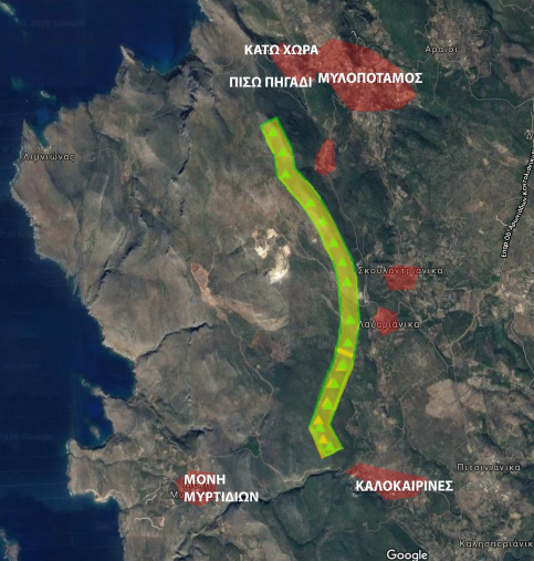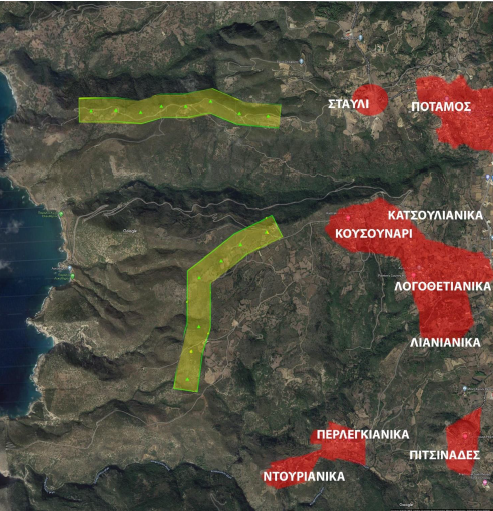 Στην περίπτωση των βιομηχανικών αιολικών σταθμών στις δύο αυτές περιοχές ΦΟΙΝΙΚΙΕΣ και ΜΕΡΜΗΓΚΑΡΗΣ υπάρχει σαφέστατη παραβίαση των διατάξεων της νομοθεσίας καθώς οι αποστάσεις των χωριών ΚΟΥΣΟΥΝΑΡΙ, ΛΑΖΑΡΙΑΝΙΚΑ, ΡΙΖΕΣ είναι μικρότερη των 500 μέτρων από τις πλησιέστερες ανεμογεννήτριες και η απόσταση του παραδοσιακού οικισμού του ΜΥΛΟΠΟΤΑΜΟΥ πολύ μικρότερη των 1500 μέτρων που η νομοθεσία ορίζει.