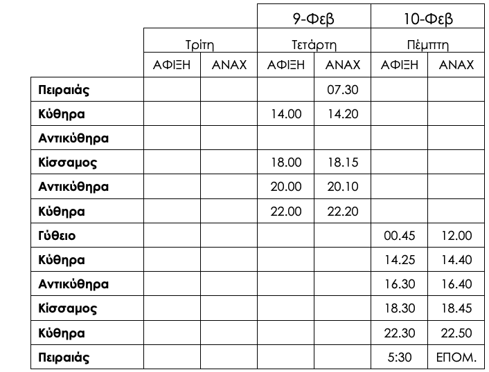 Eνημερώνουμε το επιβατικό κοινό ότι λόγω των πολύ δυσμενών καιρικών συνθηκών που θα επικρατούν στη θαλάσσια περιοχή του πλου του αύριο σύμφωνα με τις προβλέψεις της ΕΜΥ , τα δρομολόγια του Ε/Γ – Ο/Γ πλοίου μας «AQUA JEWEL» από Τρίτη 8/2 έως Πέμπτη 10/2 τροποποιούνται ως κάτωθι πίνακας:
