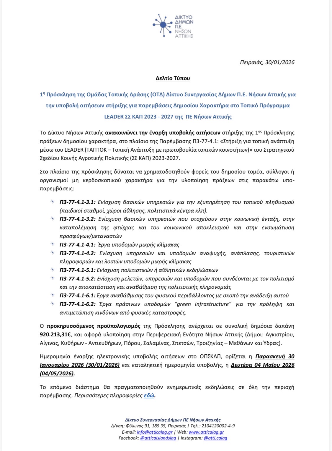 1η Πρόσκληση της Ομάδας Τοπικής Δράσης (ΟΤΔ) Δίκτυο Συνεργασίας Δήμων Π.Ε. Νήσων Αττικής για την υποβολή αιτήσεων στήριξης για παρεμβάσεις Δημοσίου Χαρακτήρα στο Τοπικό Πρόγραμμα LEADER ΣΣ ΚΑΠ 2023 – 2027 της ΠΕ Νήσων Αττικής