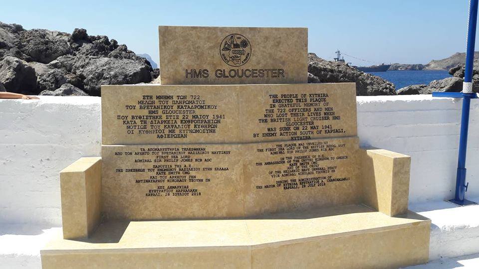 Το Σάββατο 28 Ιουλίου έλαβαν χώρα στον Λιμένα Καψαλίου οι τιμητικές εκδηλώσεις του Δήμου Κυθήρων για τους 722 νεκρούς του HMS Gloucester που βυθίστηκε το Μάιο του 1941 νοτίως των Κυθήρων από γερμανικά πυρά.