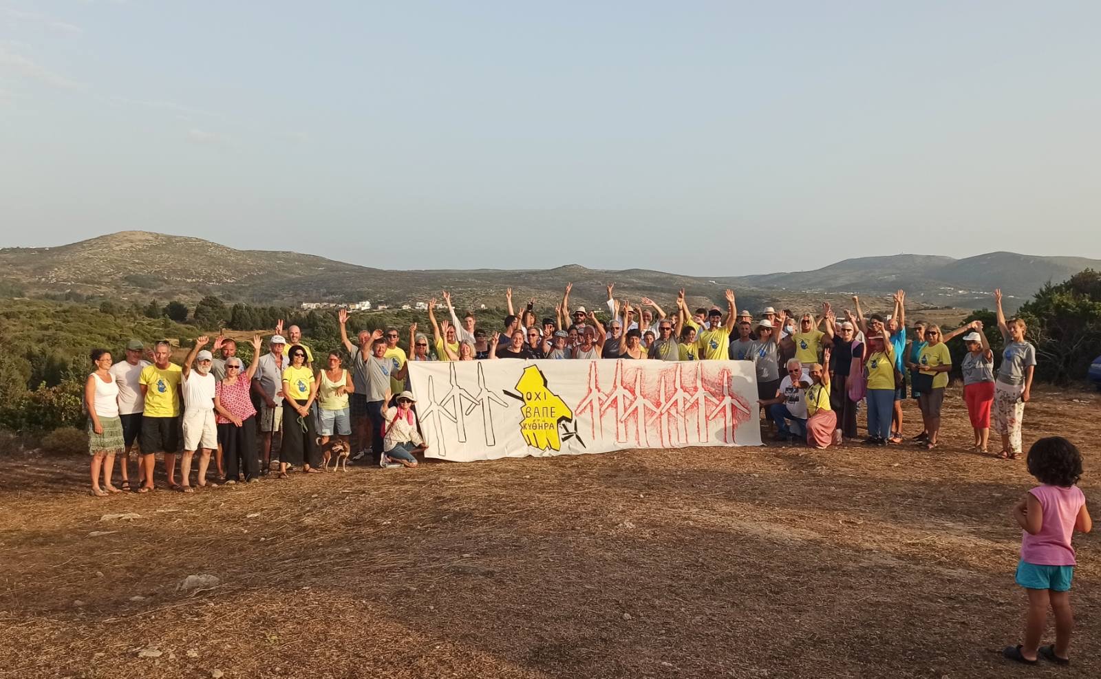 Παρά τις υψηλές θερμοκρασίες, υπήρξε μεγάλη προσέλευση από κατοίκους  διαφορετικών ηλικιών και εθνικοτήτων, που τους ενώνει η αγωνία τους για το μέλλον του νησιού, και που θέλησαν να δηλώσουν με την παρουσία τους την αμέριστη συμπαράστασή τους στον αγώνα κατά των βιομηχανικών αιολικών σταθμών.