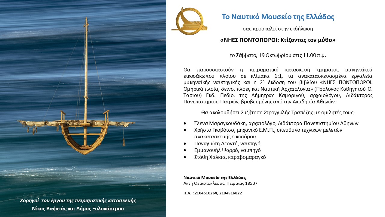 Το Ναυτικό Μουσείο Ελλάδος σάς προσκαλεί στην εκδήλωση με τίτλο «ΝΗΕΣ ΠΟΝΤΟΠΟΡΟΙ: Κτίζοντας τον Μύθο», που θα πραγματοποιηθεί το Σάββατο 19 Οκτωβρίου, στις 11:00 π.μ. στις αίθουσες του Μουσείου.