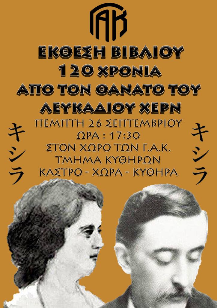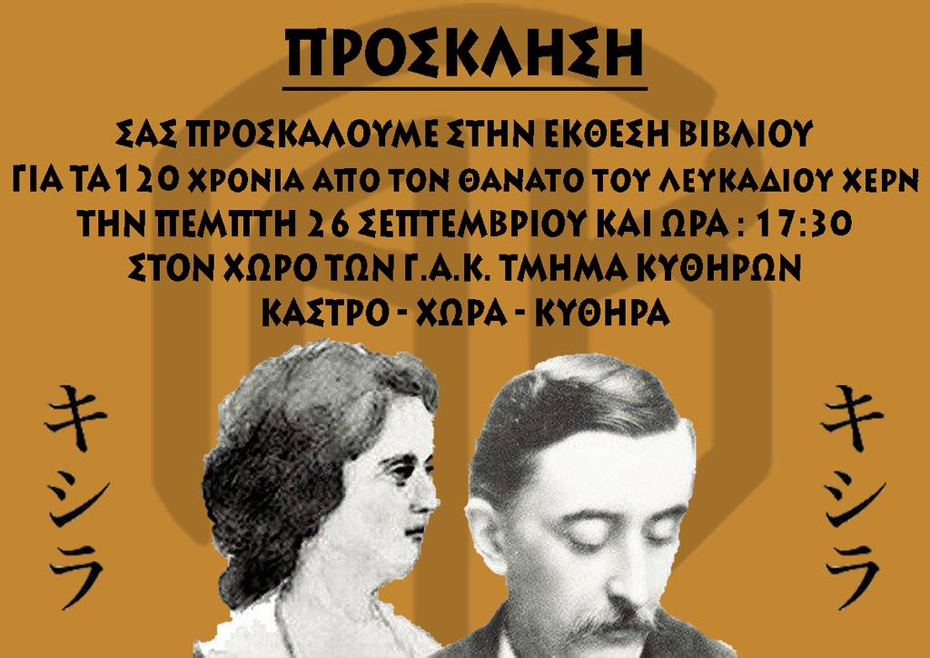 Με αφορμή τη συμπλήρωση 120 ετών από το θάνατο του διεθνούς φήμης εθνικού συγγραφέα της Ιαπωνίας Λευκαδίου Χερν, εκ μητρός Κυθηρίου , το ΓΑΚ- Τμήμα Κυθήρων τιμώντας τη μνήμη του, διοργανώνει έκθεση βιβλίου που θα πραγματοποιηθεί στο ισόγειο του Αρχείου μας , στο Κάστρο των Κυθήρων στις 26 Σεπτεμβρίου και ώρα 17.30.