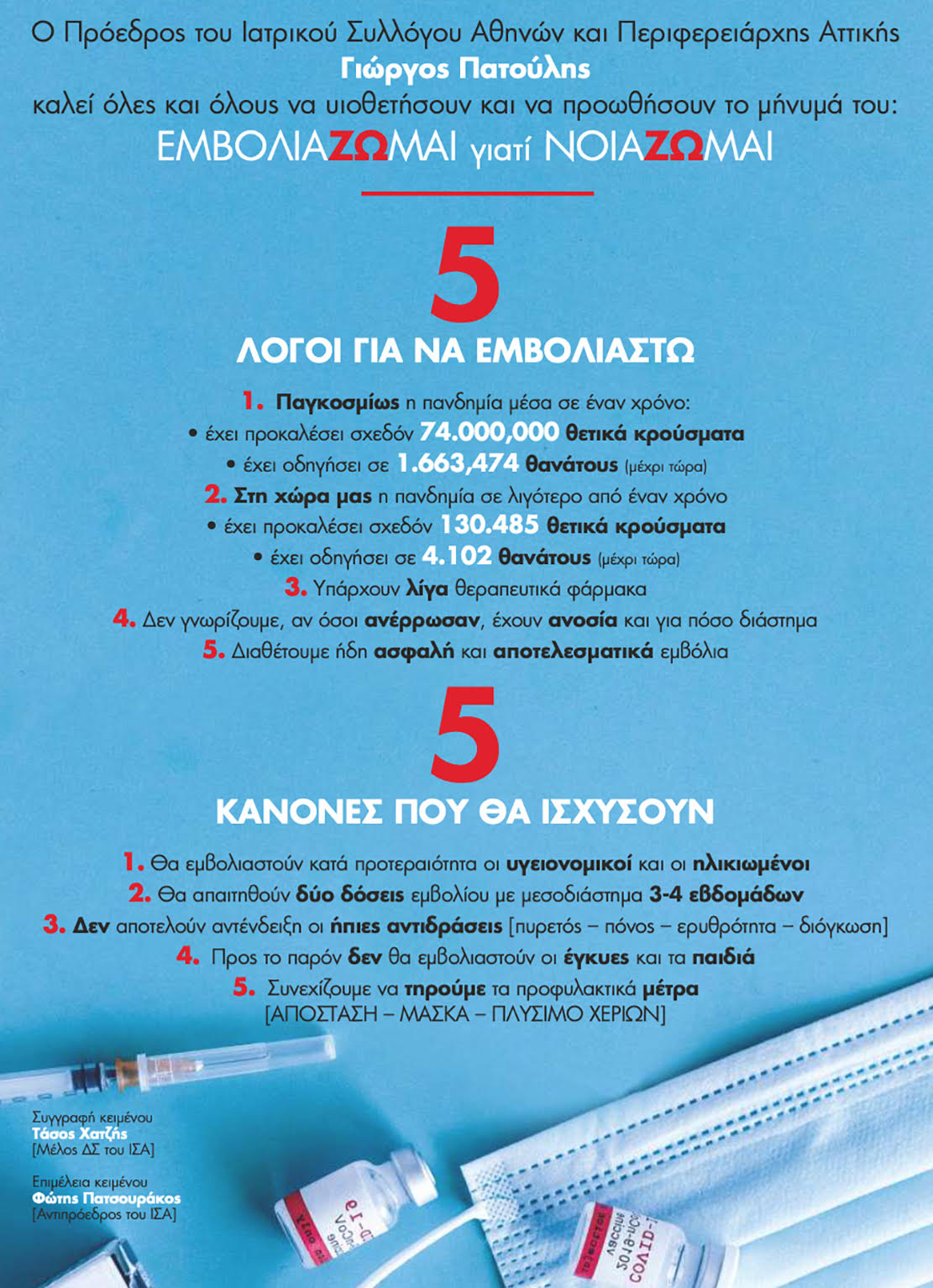 Το ένα φυλλάδιο έχει τίτλο ΕμβολιάΖΩμαι Γιατί ΝοιάΖΩμαι και μεταφέρει το μήνυμα του Περιφερειάρχη Αττικής και Προέδρου του ΙΣΑ Γ. Πατούλη, που καλεί τους πολίτες να υιοθετήσουν και να προωθήσουν το μήνυμα για τον εμβολιασμό για τον Sars-Cοv-2. Μάλιστα, επισημαίνει 5 λόγους, για τους οποίους οι πολίτες πρέπει να κάνουν το εμβόλιο.