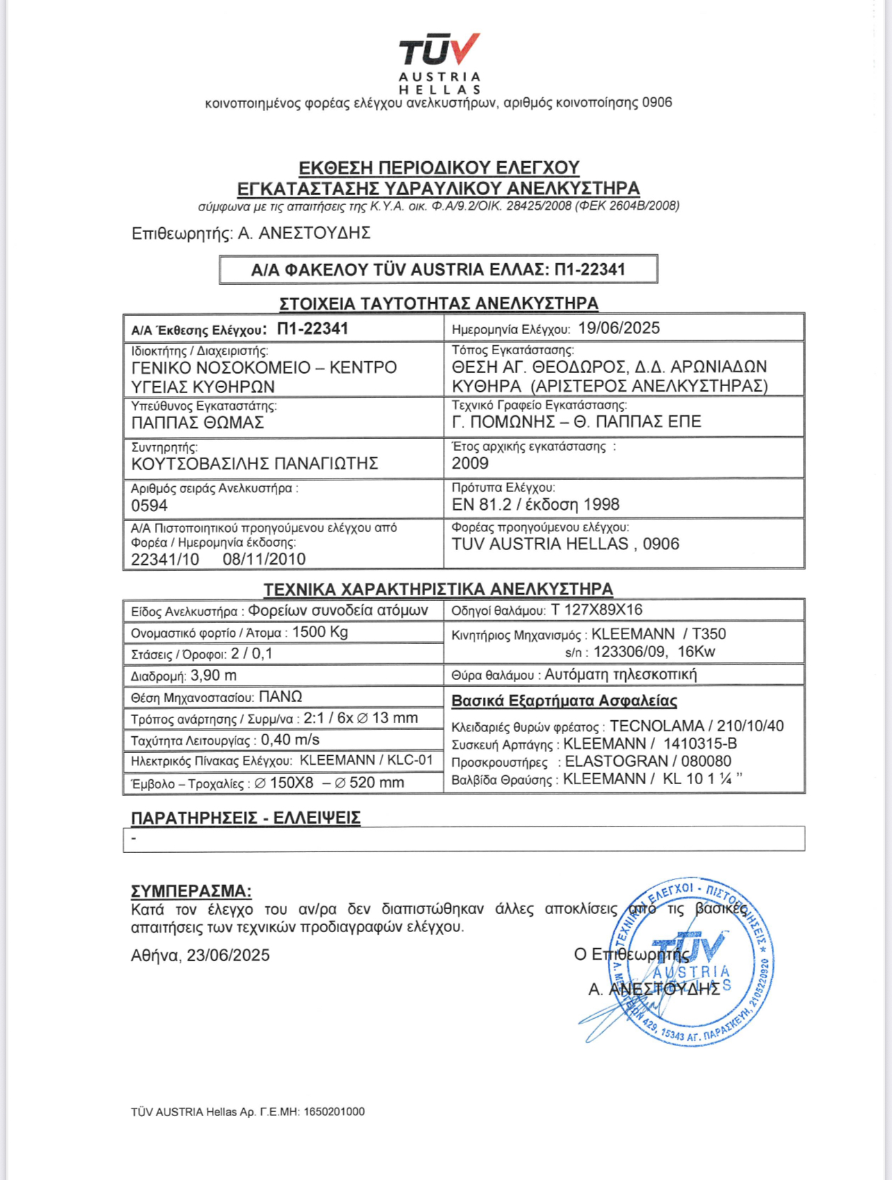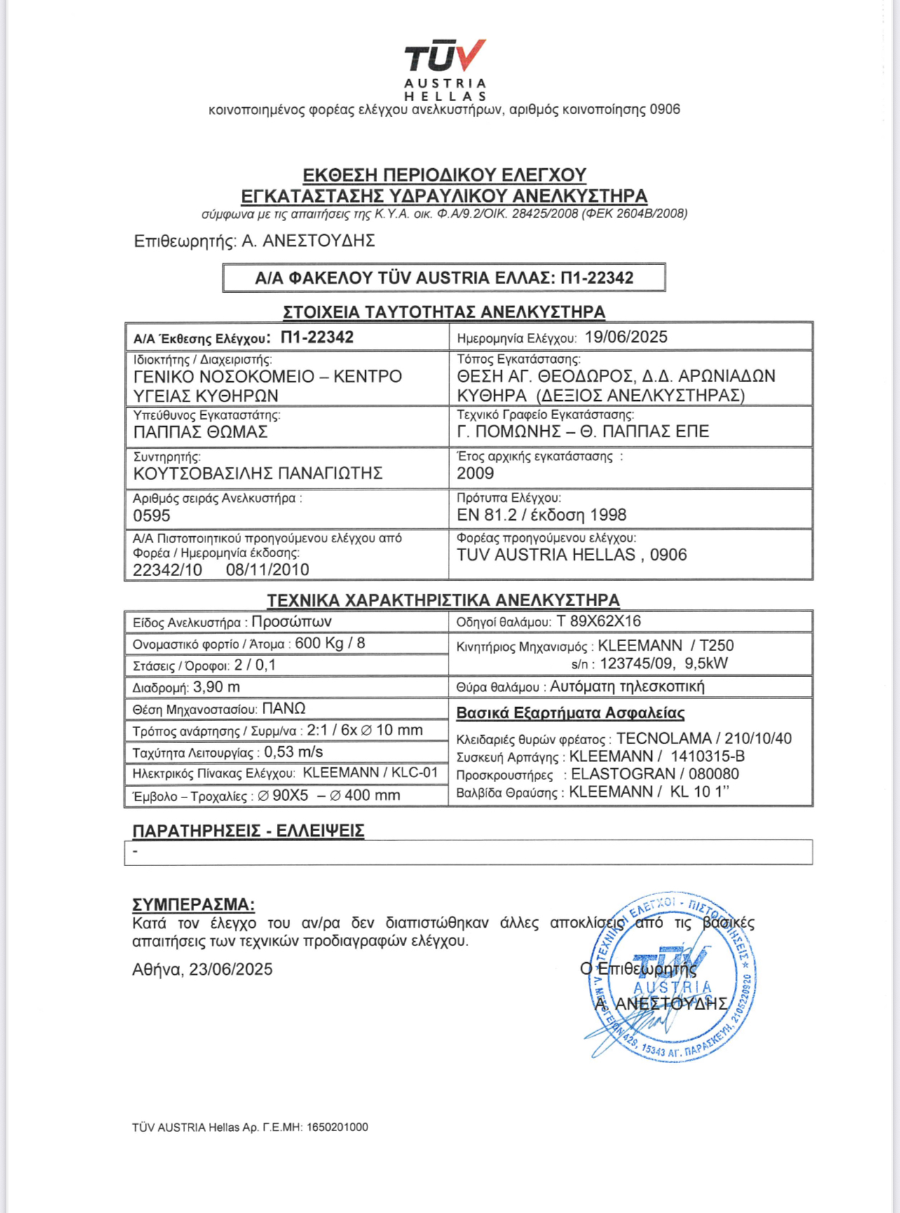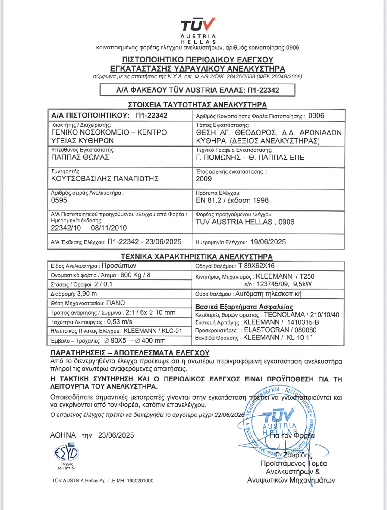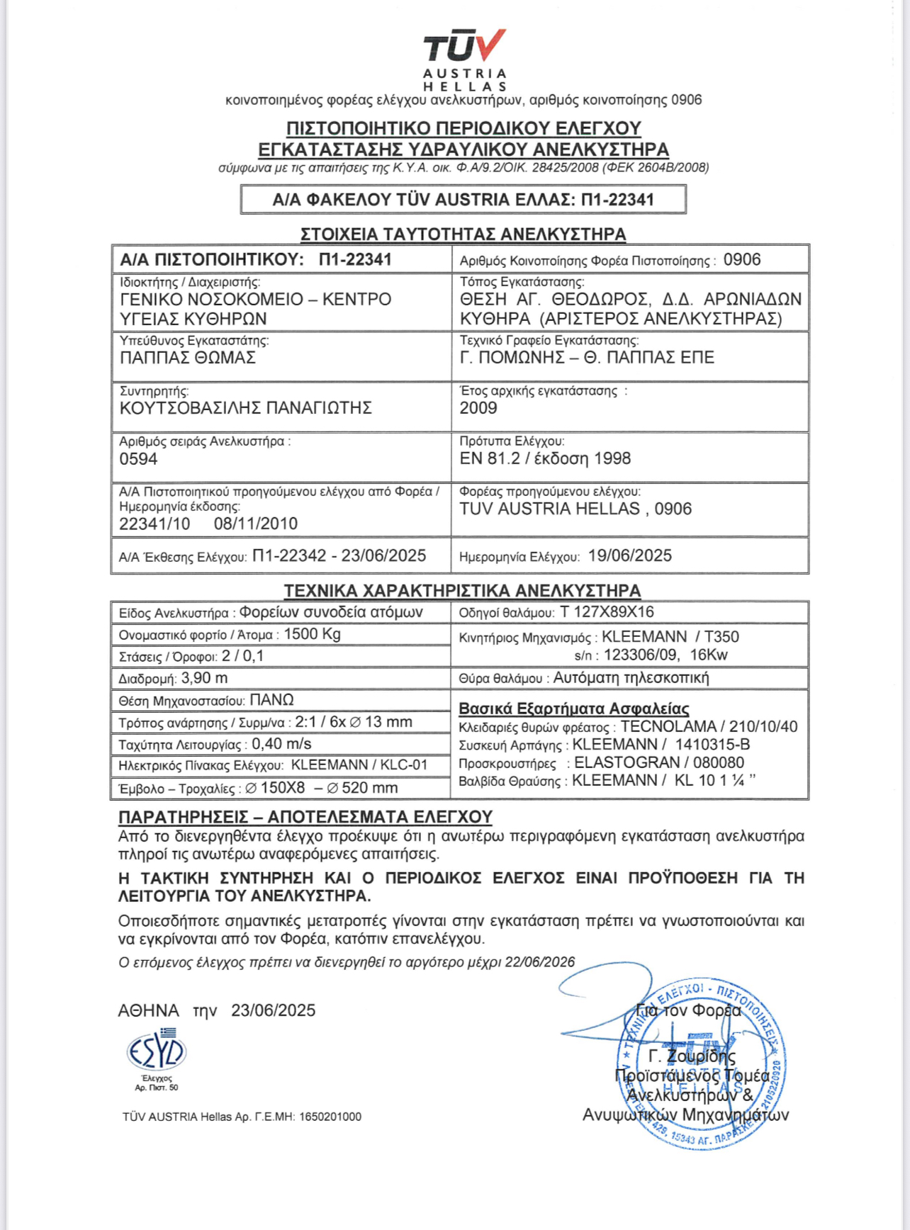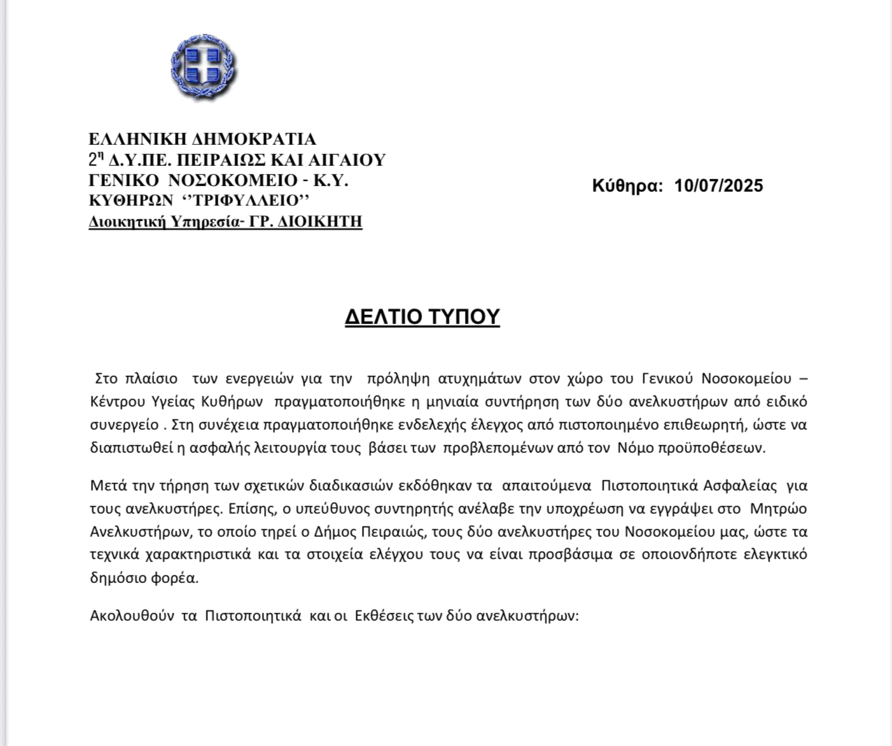 ΔΕΛΤΙΟ ΤΥΠΟΥ ΓΝ ΚΥ ΚΥΘΗΡΩΝ 10-07-2025 Πιστοποίηση ανελκυστήρων νοσοκομείου