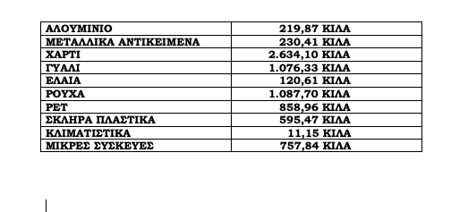 Σύμφωνα με τα στατιστικά οι ποσότητες των ανακυκλώσιμων που συγκεντρώθηκαν ανά υλικό διαμορφώνονται ως εξής: