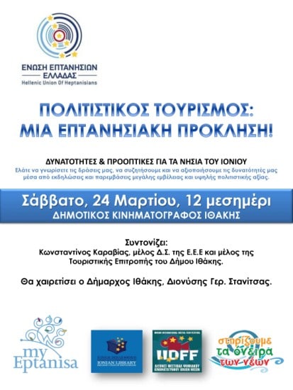 Στη συνέχεια, την ίδια ημέρα στις 12 το μεσημέρι, έχει προγραμματιστεί εκδήλωση – συζήτηση με τους Πολιτιστικούς Φορείς της Ιθάκης και το κοινό, με θέμα «ΠΟΛΙΤΙΣΤΙΚΟΣ ΤΟΥΡΙΣΜΟΣ: MIA EΠΤΑΝΗΣΙΑΚΗ ΠΡΟΚΛΗΣΗ», με ζωντανή αναμετάδοση μέσω live streaming για όσους επιθυμούν να παρακολουθήσουν την εξέλιξη της συζήτησης, ενώ την επόμενη ημέρα η αποστολή της Ε.Ε.Ε. θα συμμετέχει στο πρόγραμμα του εορτασμού της 25ης Μαρτίου με παρακολούθηση των εκδηλώσεων και κατάθεση στεφάνου στο Μνημείο των Ηρώων στο Βαθύ Ιθάκης από τον Πρόεδρο, κ. Δ. Πολλάτο.
