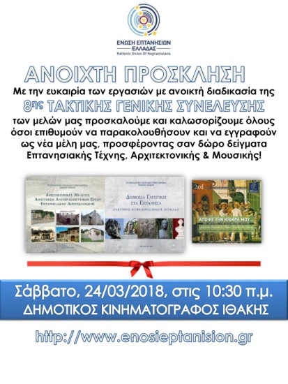 Η Γενική Συνέλευση είναι προγραμματισμένη να λάβει χώρα το Σάββατο, 24/3, στις 10:30 πμ στον Δημοτικό Κινηματογράφο της Ιθάκης, με ανοικτή διαδικασία, έτσι ώστε να την παρακολουθήσουν και όλοι όσοι ενδιαφέρονται να γνωρίσουν τα πρόσωπα και το έργο της μη-κερδοσκοπικής οργάνωσης για τη διάσωση, προβολή και διάδοση του επτανησιακού πολιτισμού. Τα εγγεγραμμένα μέλη της Ε.Ε.Ε.έχουν το δικαίωμα να συμμετέχουν και με ζωντανή μετάδοση μέσω skype σε περίπτωση που αδυνατούν να παρευρεθούν.