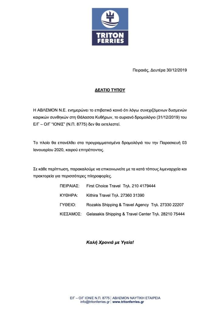 AdvertisementΑνακοινώσεις _ Δελτία Τύπου Δελτίο Τύπου ΙΟΝΙΣ – Μη εκτέλεση δρομολογίου την Δεκ 30, 2019 516