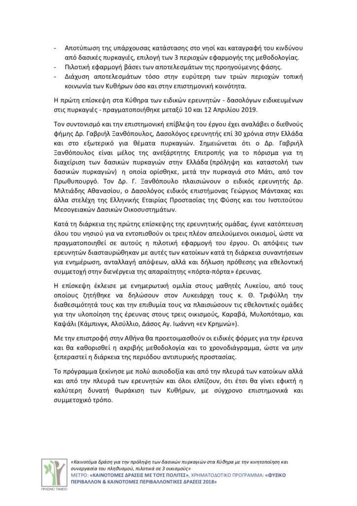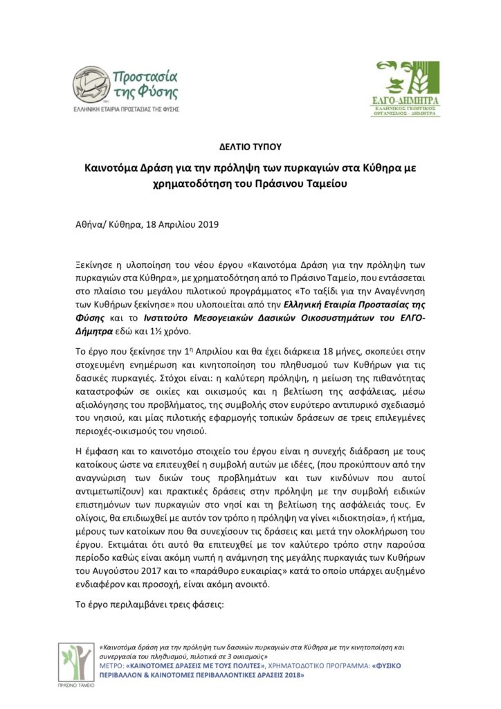 ΔΕΛΤΙΟ ΤΥΠΟΥ – Καινοτόμα Δράση για την πρόληψη των πυρκαγιών στα Κύθηρα με χρηματοδότηση του Πράσινου Ταμείου