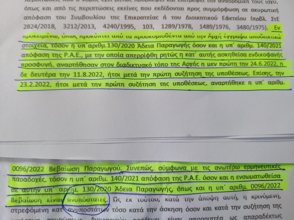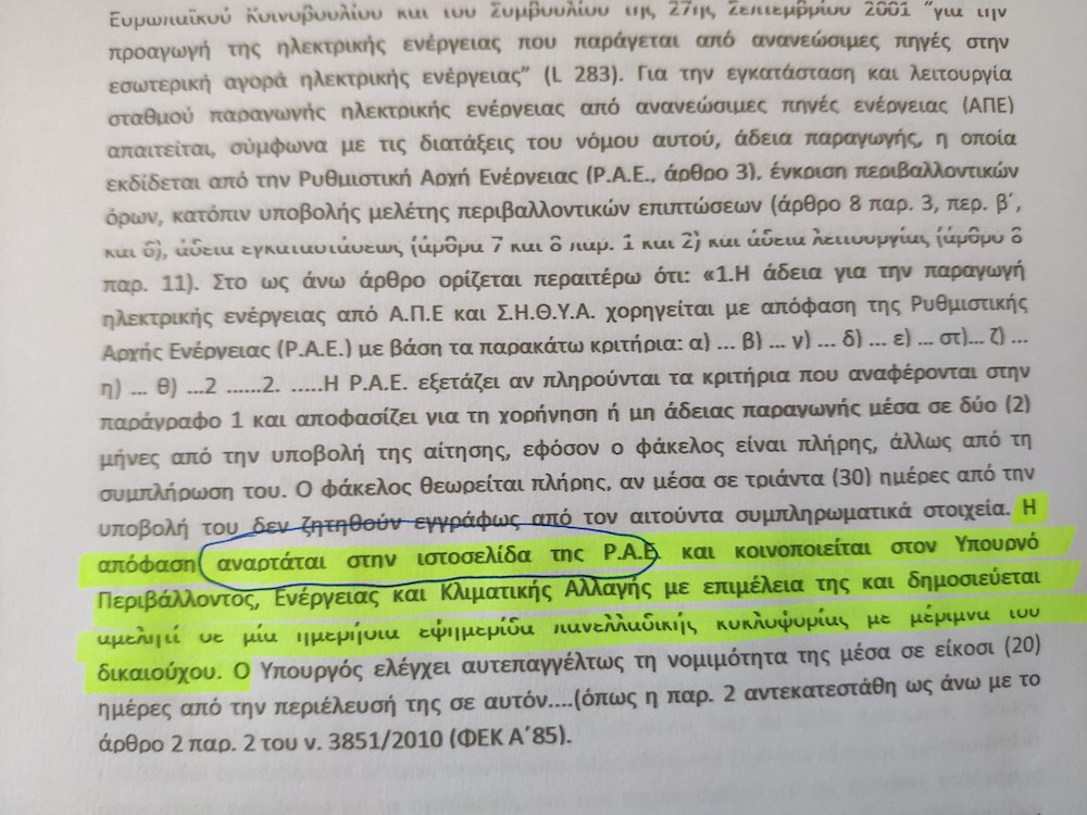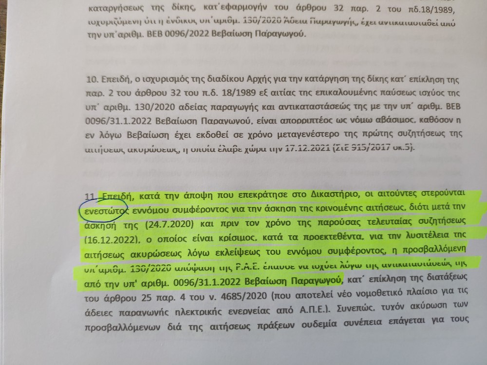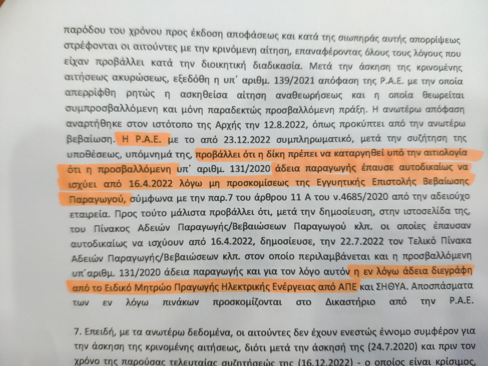 Με προδικαστικη αποφαση στις 27-5-2022 είχε δοθεί από το δικαστήριο στη Ρ.Α.Ε ένας μήνας περιθώριο για να αποδείξει ότι η ανάρτηση των αδειών παραγωγής είχε δημοσιευτεί εγκαίρως στο website της, αλλιώς οι άδειες θα κρίνονταν ανυπόστατες όπως ο νόμος ορίζει! Η Ρ.Α.Ε., όμως, δεν προσκόμισε επαρκή στοιχεία και οι άδειες αναρτήθηκαν στο website της 2 χρόνια αργότερα!