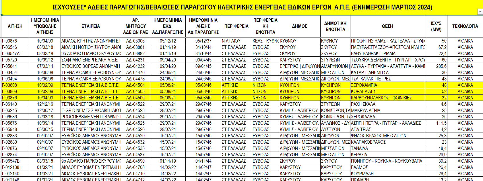 Στις 18-10- 2024 εκδικάζονται στο Εφετείο Αθηνών οι αιτήσεις ακύρωσης των αδειών παραγωγής ηλεκτρικής ενέργειας από βιομηχανικούς αιολικούς σταθμούς που έχουν δοθεί στην εταιρεία ΤΕΡΝΑ ΕΝΕΡΓΕΙΑΚΗ και αφορούν τις περιοχές ΕΝΤΟΣ ΤΟΥ ΔΙΚΤΥΟΥ NATOURA 2000, Κορδελλίδες (περιοχή πάνω από την παραλία Ρούτσουνας στο βόρειο τμήμα του νησιού) και Ξεροκάμπια (περιοχή δυτικά από τον οικισμό Πετρούνι). Μια επιπλέον άδεια αφορά την περιοχή Φοινικίες (δυτικότερα των Λογοθετιανίκων) η οποία βρίσκεται σε απόσταση 700 μέτρων από την περιοχή NATOURA 2000. Πρόκειται για έργα συνολικής ισχύος 132 μεγκαβάτ, με ανεμογεννήτριες μεγέθους από 120 εώς 250μ. Εκτός του Κ.Ι.Π.Α, πλήθους πολιτών και σωματείων-συλλόγων του νησιού, ο Δήμος Κυθήρων καθώς και η Επιτροπή Εγχωρίου Περιουσίας έχουν επίσης προσφύγει στη δικαιοσύνη για τις υποθέσεις αυτές. Λόγω συνάφειας οι αιτήσεις ακύρωσης ενδέχεται να εκδικαστούν την ίδια μέρα.