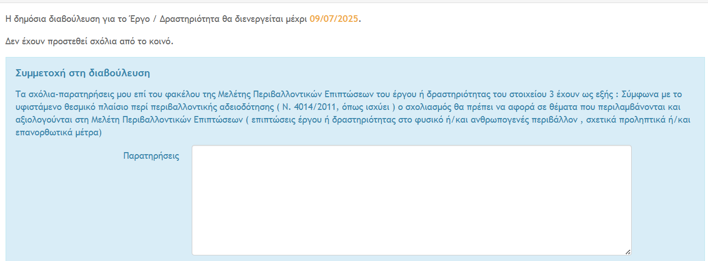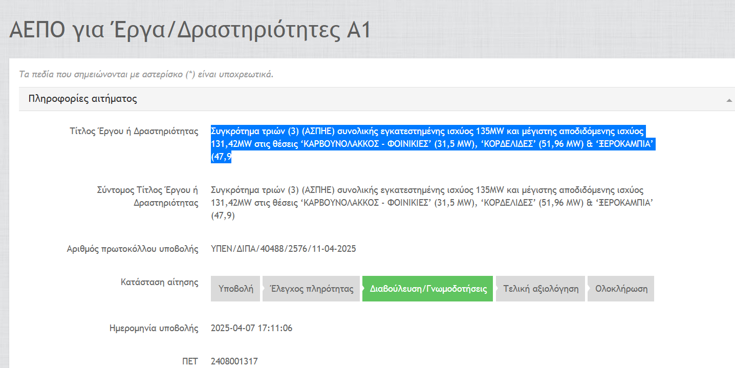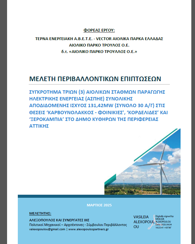 Η ΜΕΛΕΤΗ ΠΕΡΙΒΑΛΛΟΝΤΙΚΩΝ ΕΠΙΠΤΩΣΕΩΝ βρίσκεται αναρτημένη στο ΗΛΕΚΤΡΟΝΙΚΟ ΠΕΡΙΒΑΛΛΟΝΤΙΚΟ ΜΗΤΡΩΟ του Υπουργείου Περιβάλλοντος (https://eprm.ypen.gr/) και η διαβούλευσή της λήγει στις 9-7-2025.