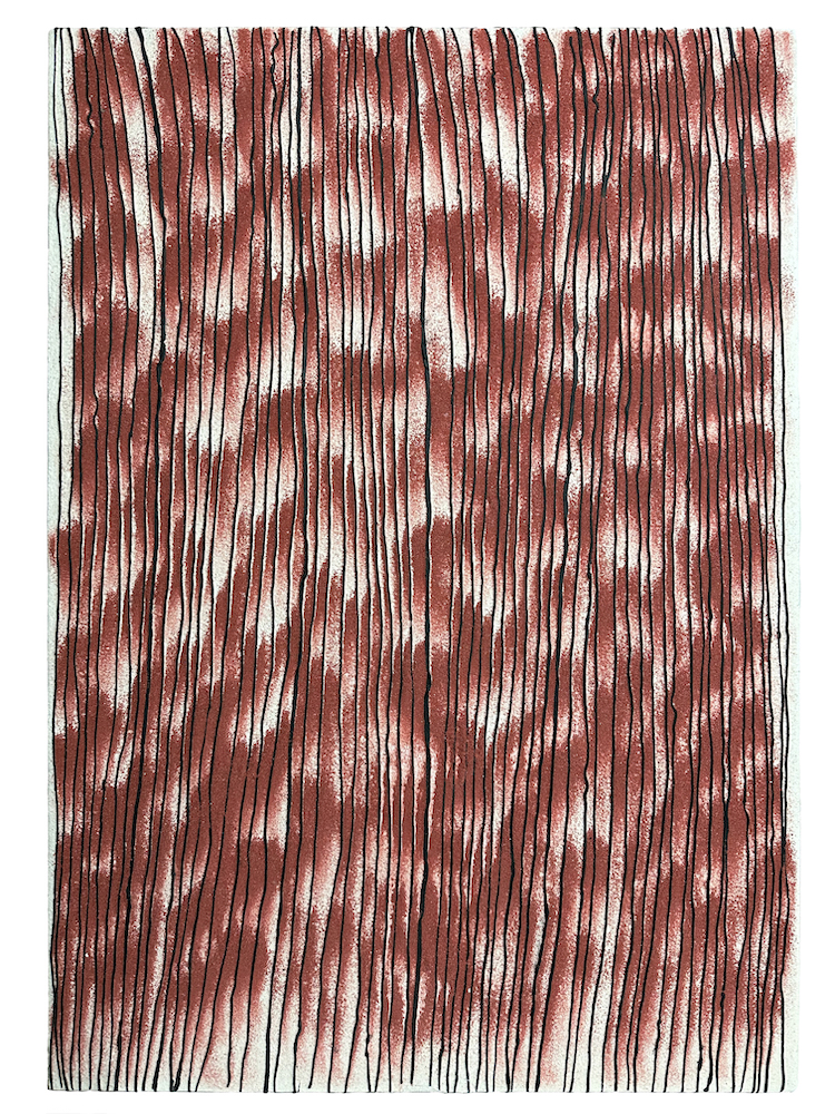 Το κύριο υλικό των έργων του είναι η μαρμαρόσκονη χρωματισμένη με φυσικές τεχνικές, ένα στερεό υλικό με συμπεριφορά υγρού. Η επιφάνεια των έργων είναι δομημένη από ανάγλυφες παράλληλες γραμμές, οι οποίες δημιουργούν ανάμεσά τους τμήματα που λειτουργούν σαν καθορισμένες διαδρομές, όπου μέσα σε αυτά τα όρια μπορούν να αναπτύσσονται ρυθμογενετικοί σχηματισμοί.