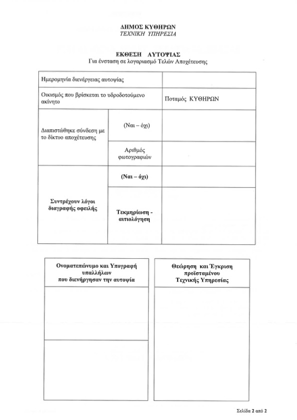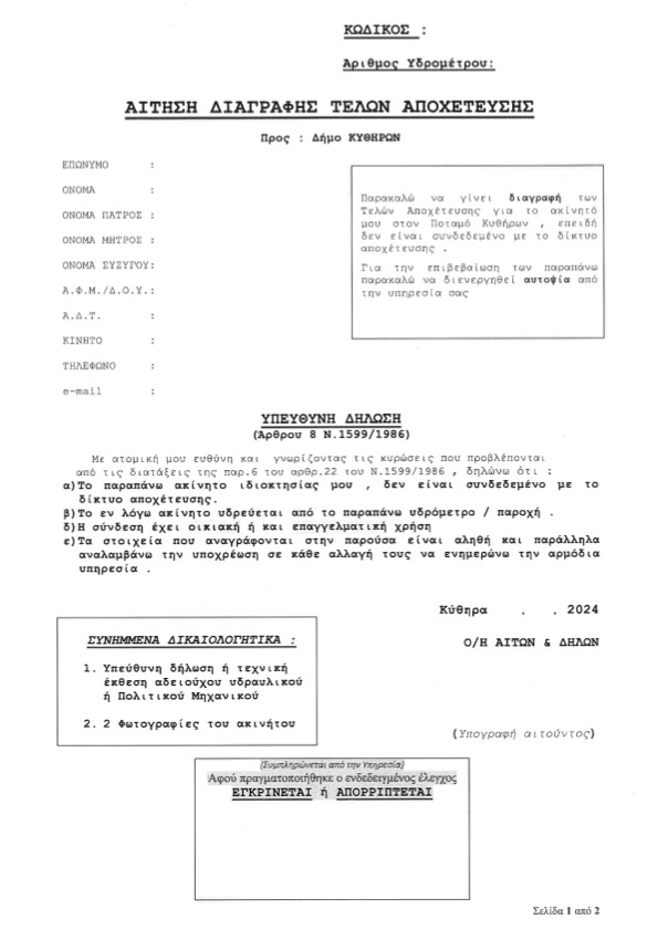 Στις εύλογες διαμαρτυρίες των κατοίκων, η απάντηση της αρμόδιας υπηρεσίας του Δήμου μας ήταν «καταθέστε ένσταση». Στελέχη μας πήγαν στις αρμόδιες υπηρεσίες του Δήμου Κυθήρων από όπου έλαβαν αίτηση διαγραφής τελών αποχέτευσης ( επισυνάπτεται η αίτηση ) για να την υποβάλλουν. Στα συνημμένα έγγραφα που απαιτούνται είναι «υπεύθυνη δήλωση ή τεχνική έκθεση αδειούχου υδραυλικού ή πολιτικού μηχανικού»… Με λίγα λόγια για να μην μας χαρατσώσουν για υπηρεσίες που δεν μας παρέχουν, προτείνουν να πληρώσουμε μόνοι μας έναν πολιτικό μηχανικό η υδραυλικό (αδειούχο μάλιστα…) για να αποδείξουμε ότι «δεν είμαστε ελέφαντες»… Ο Δήμαρχος κ.Χαρατσάκης τι λέει για αυτό;