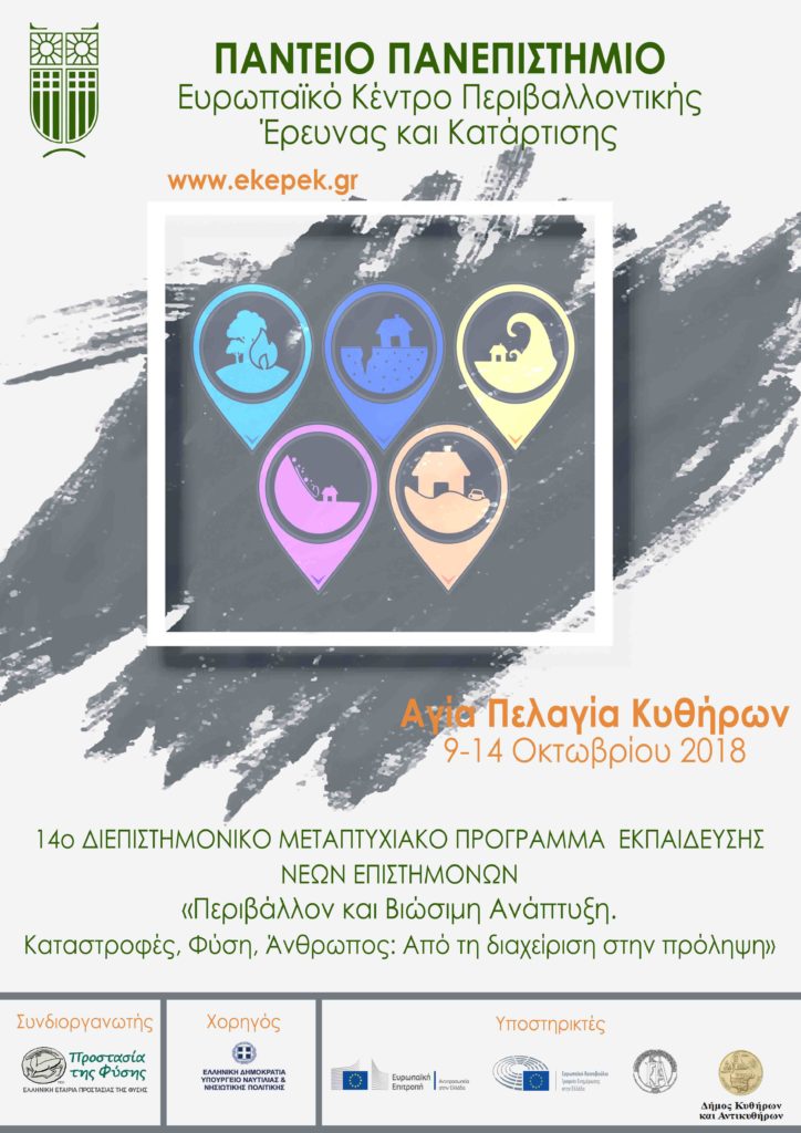 Ολοκληρώθηκε με επιτυχία το 14ο Διεπιστημονικό Μεταπτυχιακό Πρόγραμμα Εκπαίδευσης Νέων Επιστημόνων «Περιβάλλον και Βιώσιμη Ανάπτυξη. Καταστροφές, Φύση, Άνθρωπος: Από τη διαχείριση στην πρόληψη», το οποίο διοργάνωσε το Ευρωπαϊκό Κέντρο Περιβαλλοντικής Έρευνας και Κατάρτισης του Παντείου Πανεπιστημίου, σε συνεργασία με την Ελληνική Εταιρία Προστασίας της Φύσης, από τις 9 έως τις 14 Οκτωβρίου 2018, στην Αγία Πελαγία Κυθήρων.