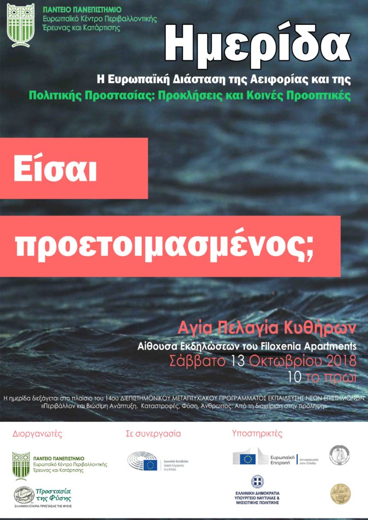 Το Σάββατο 13 Οκτωβρίου 2018 πραγματοποιήθηκε Επιστημονική Ημερίδα με θέμα: «Η Ευρωπαϊκή Διάσταση της Αειφορίας και της Πολιτικής Προστασίας: Προκλήσεις και Κοινές Προοπτικές», την οποία παρακολούθησαν συνολικά σαράντα (40) άτομα. Την Ημερίδα χαιρέτησαν ο Δήμαρχος Κυθήρων και Αντικυθήρων, κ. Ευστρ. Χαρχαλάκης, η κα Αλ. Νικηφοράκη της ΕΕΠΦ, ο κ. Μ. Χάρος εκ μέρους του ΚΙΠΑ, καθώς και εκπρόσωποι του Πολεμικού Ναυτικού, του Πυροσβεστικού Σώματος, και του Εθνικού Αστεροσκοπείου Αθηνών. Οι δύο συνεδρίες στρογγυλής τραπέζης που ακολούθησαν πραγματεύτηκαν την αντιμετώπιση των φυσικών και ανθρωπογενών κινδύνων, αλλά και τα σχετικά δεδομένα στον Ελληνικό θαλάσσιο και νησιωτικό χώρο, με έμφαση στην Ευρωπαϊκή Διάσταση.