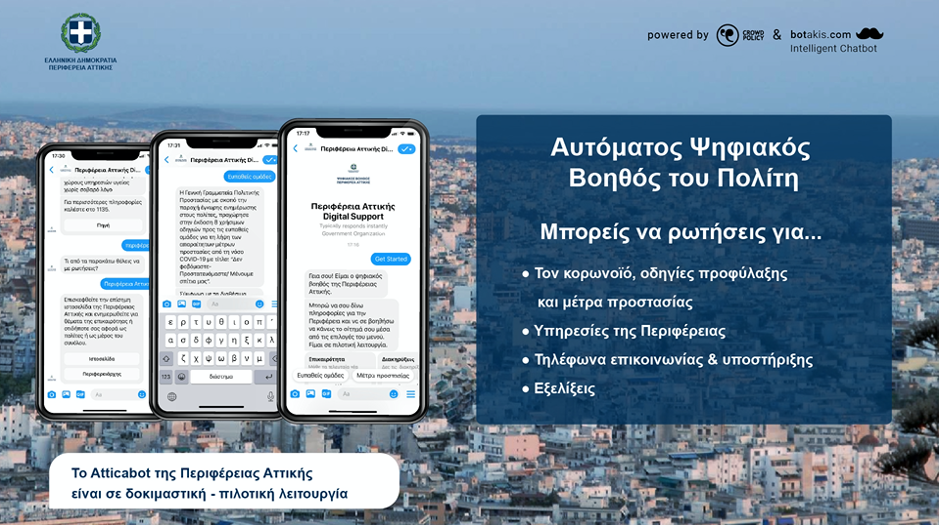 Ο Ψηφιακός Βοηθός της Περιφέρειας Αττικής (atticabot) παρέχει με εύκολο και απλό τρόπο πληροφορίες και ενημέρωση για την Περιφέρεια Αττικής και τις Υπηρεσίες της και παράλληλα δίνει χρήσιμες πληροφορίες και ενημέρωση σχετικά με τον COVID-19.
