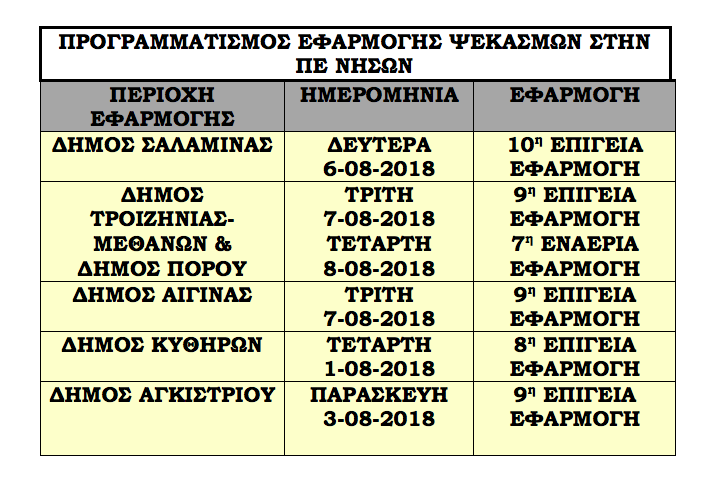 Στο πλαίσιο του ολοκληρωμένου σχεδίου δράσης κατά των κουνουπιών και λόγω της εμφάνισης κρουσμάτων του Ιού του Δυτικού Νείλου, σας γνωστοποιούμε κατωτέρω πίνακα ημερομηνιών διεξαγωγής επιπρόσθετων ψεκασμών κουνουποκτονίας ώστε να περιοριστεί η ανάπτυξη των εντόμων στις αναφερόμενες περιοχές ως ακολούθως:
