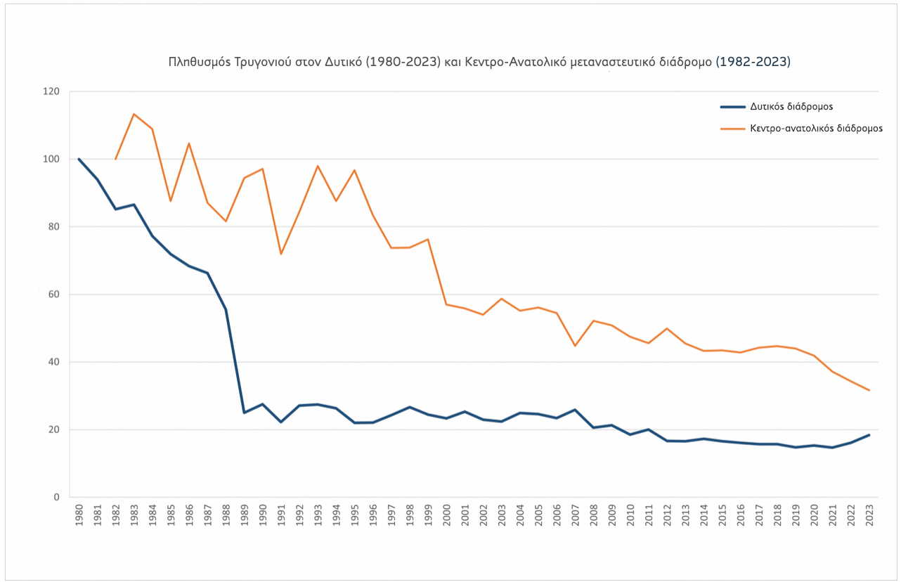 Τονίζεται ότι οι χώρες του Κεντροανατολικού διαδρόμου, συνεχίζουν να αποτελούν «μαύρη τρύπα» για το είδος, με τα Τρυγόνια να αποτελούν όχι μόνο θηρεύσιμο είδος, αλλά και θύμα μαζικής λαθροθηρίας η οποία στην Ελλάδα κορυφώνεται κατά την εαρινή μετανάστευση του είδους από τη Β. Αφρική, μεταξύ Μαρτίου και Μαΐου.