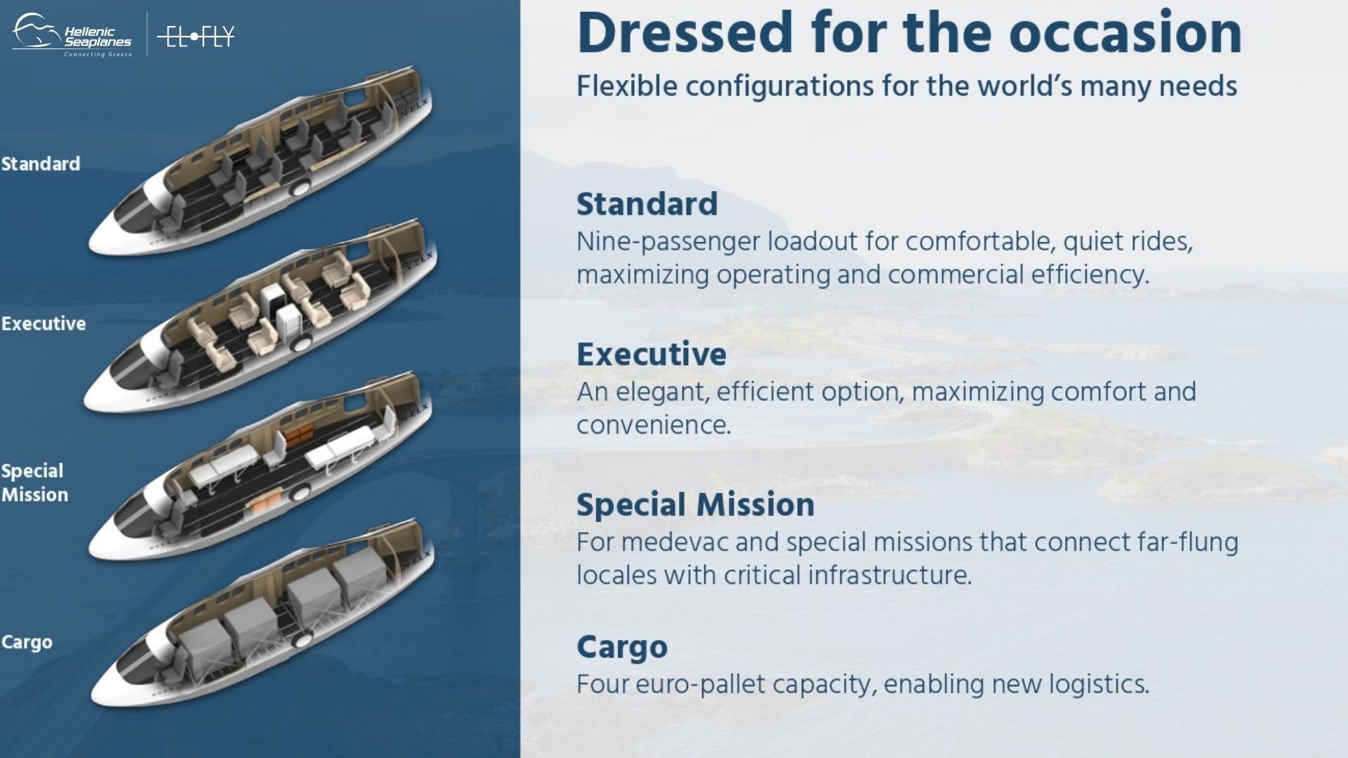 Παράλληλα, η Hellenic Seaplanes θα συνεχίσει να επιχειρεί με τα Cessna Grand Caravan (12 θέσεων) και Twin Otters (19 θέσεων), που ήδη αποτελούν μέρος του στόλου της, εξασφαλίζοντας την παροχή υψηλού επιπέδου υπηρεσιών στις συνδέσεις εντός Ελλάδας και της Μεσογείου.