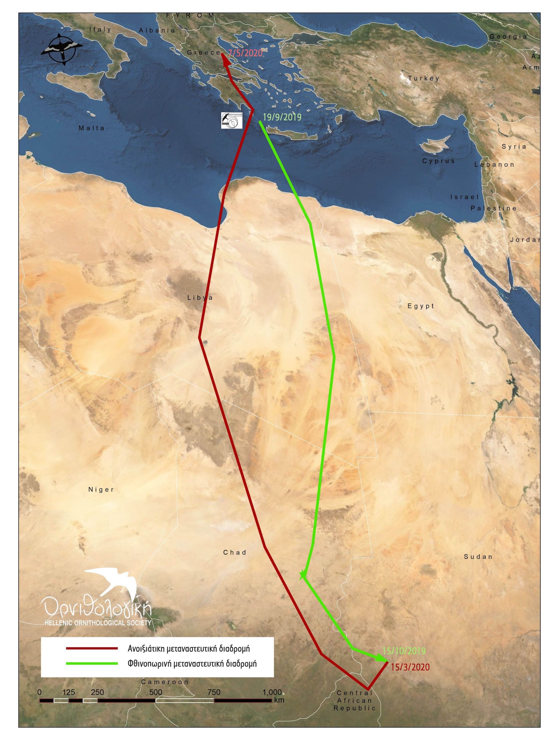 Ακολουθώντας το σήμα του δορυφορικού πομπού της, παρακολουθήσαμε την «Αθηνά» να αναχωρεί πέρσι στα μέσα Σεπτέμβρη από τα Αντικύθηρα και να φτάνει στην υποσαχάρια Αφρική, στην περιοχή του Νοτιοδυτικού Σουδάν, όπου περνά τον χειμώνα, μετά από σχεδόν έναν μήνα και διάσχιση 3.000 χιλιομέτρων. Με τον ερχομό της άνοιξης, άνοιξε ξανά τα φτερά της για τους τόπους αναπαραγωγής στην Ευρώπη. Το ταξίδι είναι πολύ δύσκολο: χρειάζεται να ξεπεράσει δύο μεγάλα εμπόδια, την έρημο Σαχάρα και τη Μεσόγειο Θάλασσα.