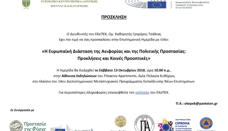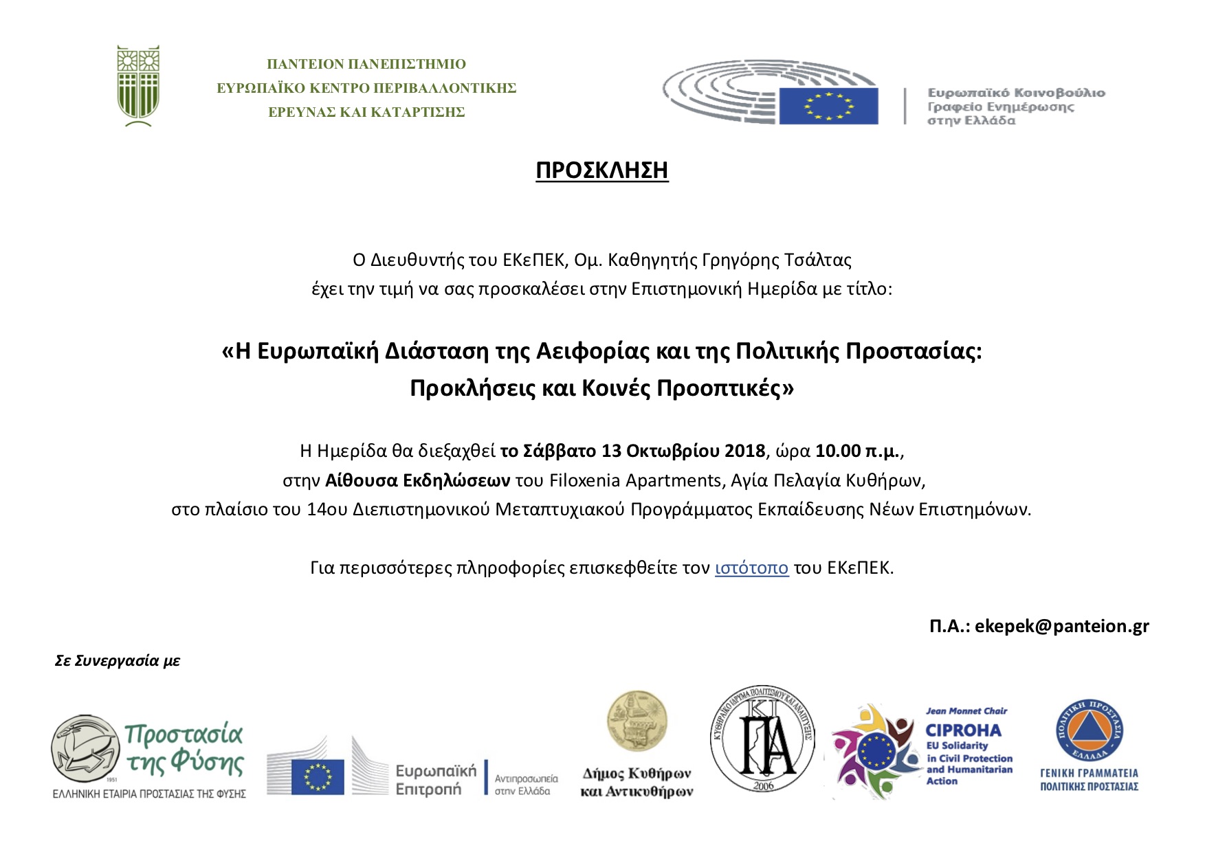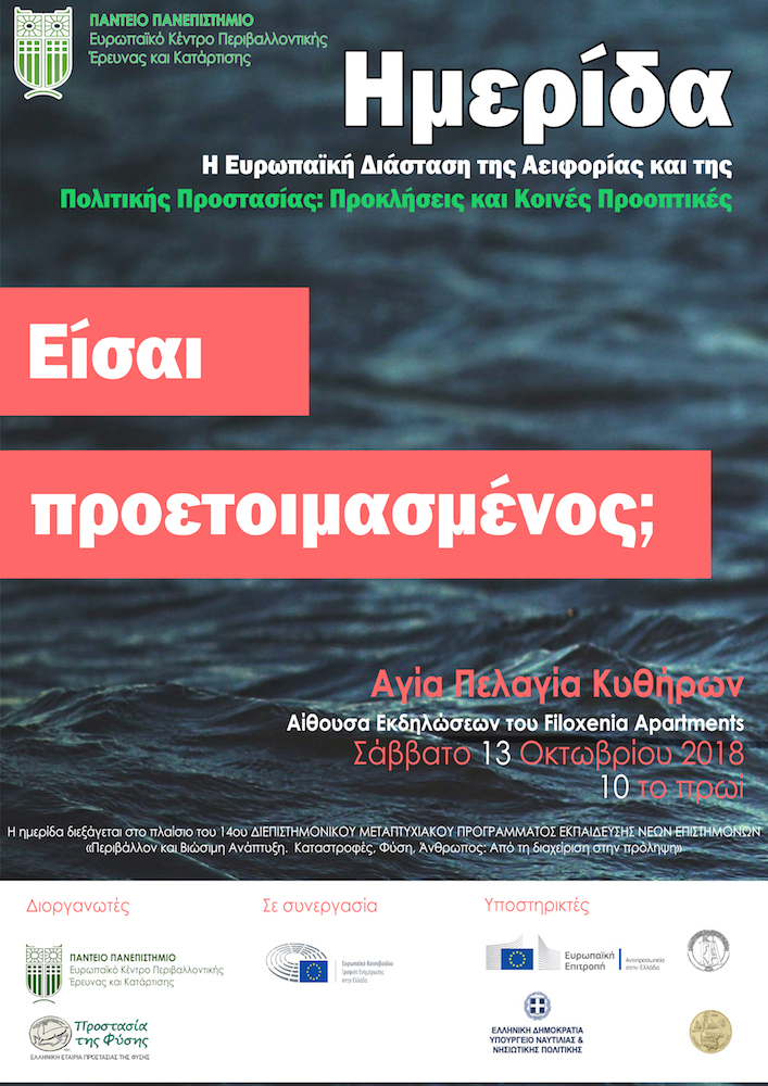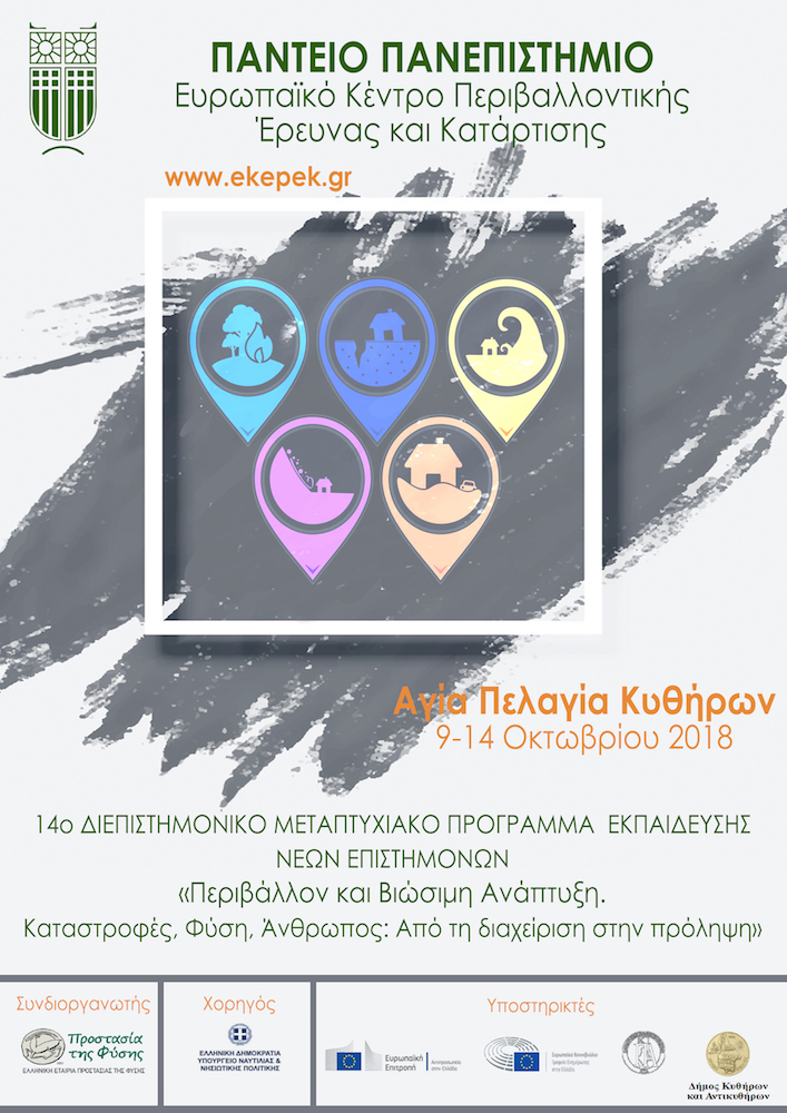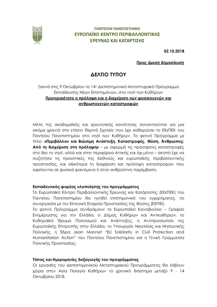 Δελτίο Τύπου Θερινού Σχολείου Κυθήρων – «Περιβάλλον και Βιώσιμη Ανάπτυξη. Καταστροφές, Φύση, Άνθρωπος: Από τη διαχείριση στη πρόληψη», 9 – 14 Οκτωβρίου 2018