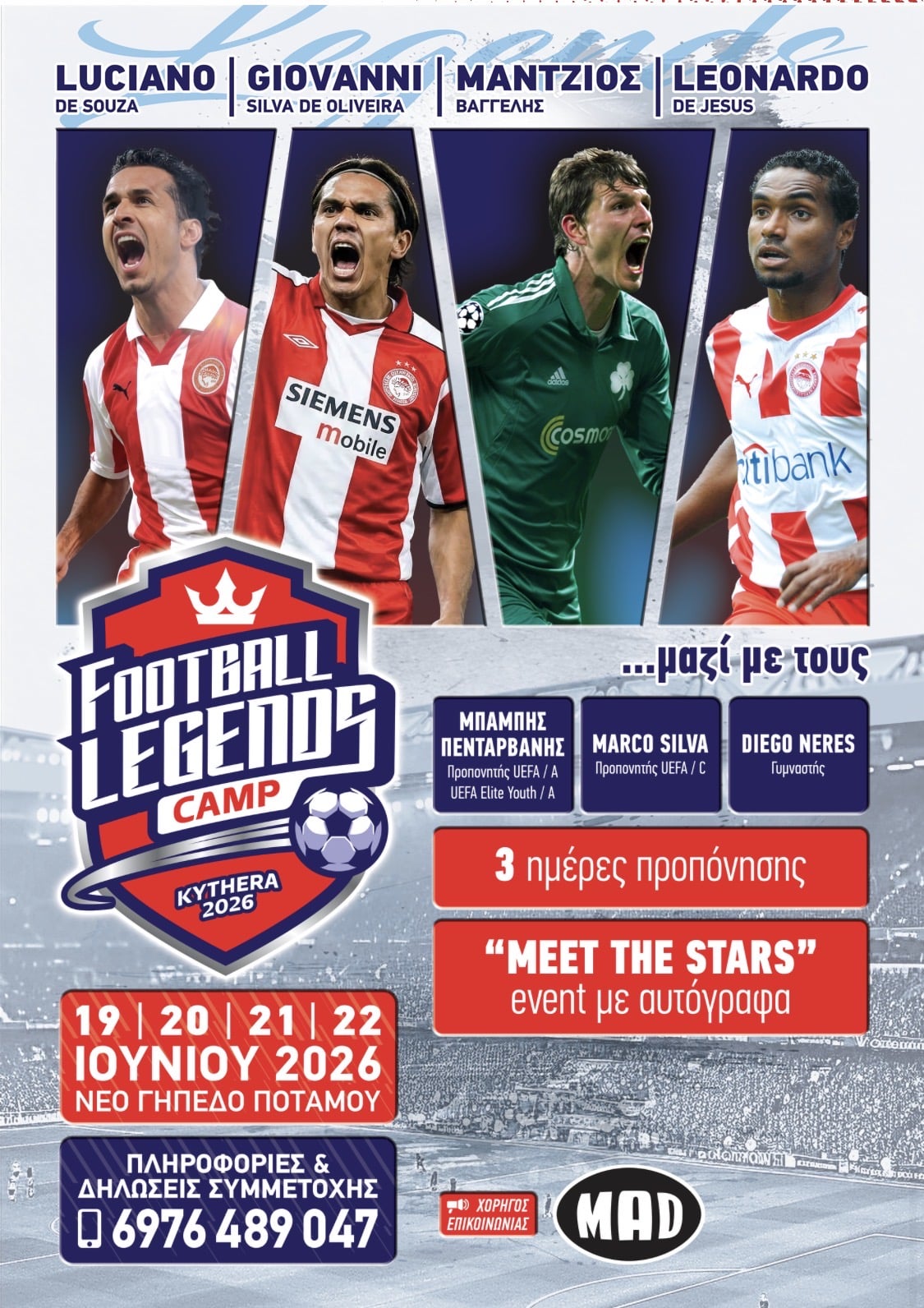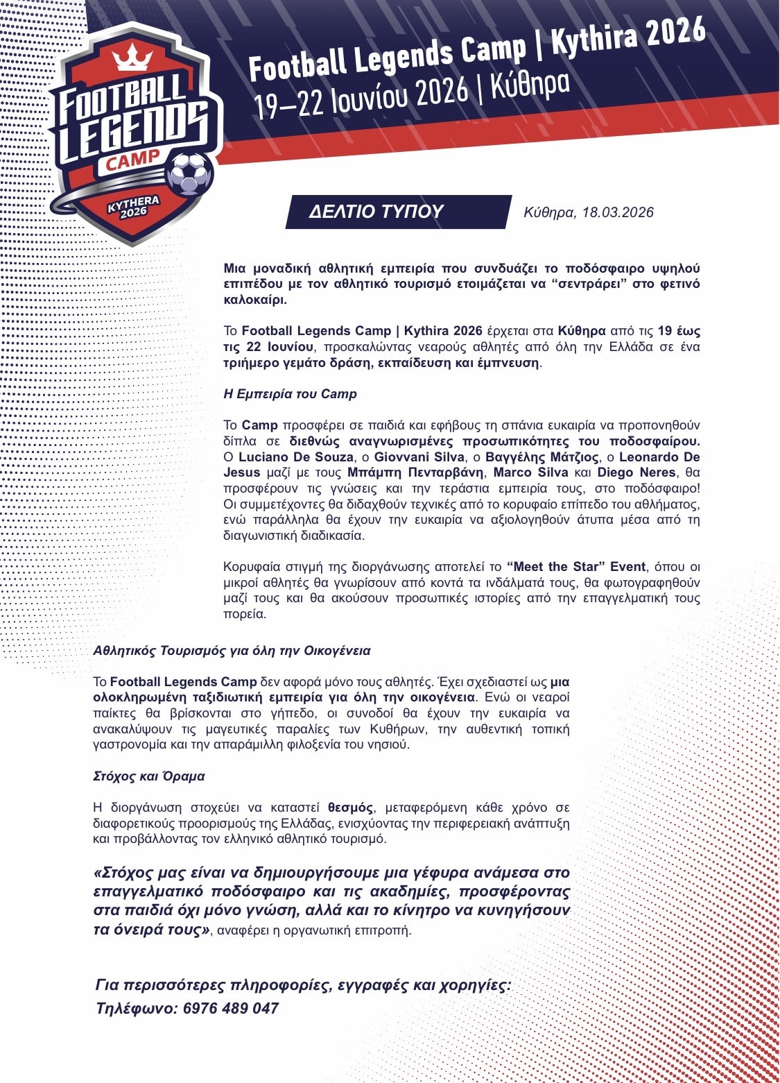 Ανακοινώσεις _ Δελτία Τύπου Δελτίο Τύπου: Το Football Legends Camp φέρνει τους θρύλους του ποδοσφαίρου στα Κύθηρα (19-22 Ιουνίου 2026) την Μαρ 21, 2026 62