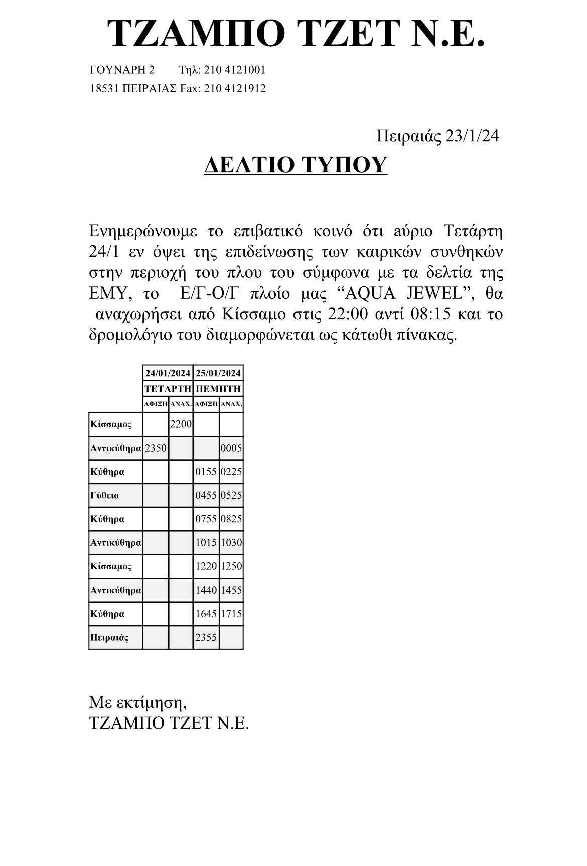 - Δελτίο Tύπου – Tροποποιήσεις δρομολογίου Aqua Jewel 24/01/24