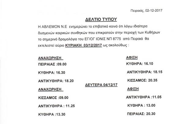 - Δελτίο Τύπου – Ματαίωση δρομολογίου ΙΟΝΙΣ