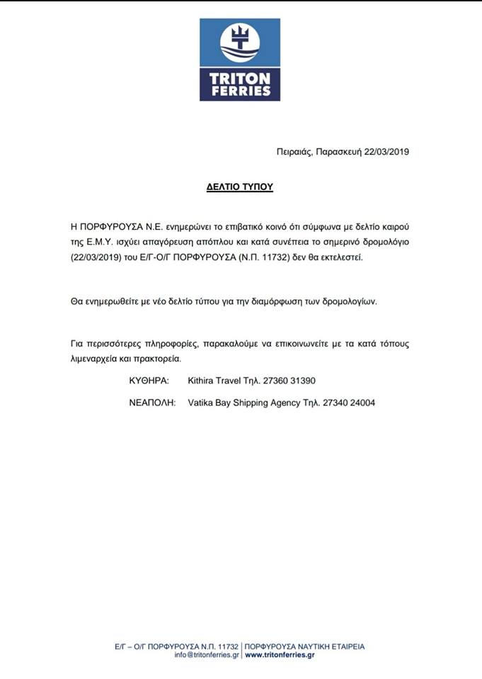 - Δεν θα εκτελεστεί το σημερινό δρομολόγιο του ΠΟΡΦΥΡΟΥΣΑ λόγω απαγορευτικού