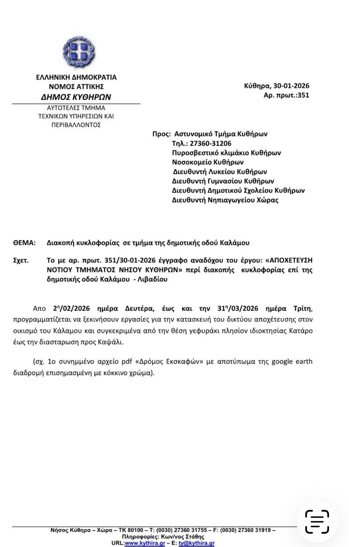 Η παρούσα κοινοποίηση γίνεται προς ενημέρωση όλων των μελών του Δημοτικού Συμβουλίου καθώς και των Προέδρων των Τοπικών Κοινοτήτων, δεδομένου ότι στην προκείμενη περίπτωση πρόκειται για προγραμματισμένη διακοπή κυκλοφορίας λόγω εκτέλεσης έργου, διάρκειας περίπου 57 ημέρων, η οποία εκ της φύσεώς της δεν μπορεί να χαρακτηριστεί ως τελείως προσωρινή ή έκτακτη κατάσταση κατά την έννοια του άρθρου 52 παρ. 2 του Κώδικα Οδικής Κυκλοφορίας.