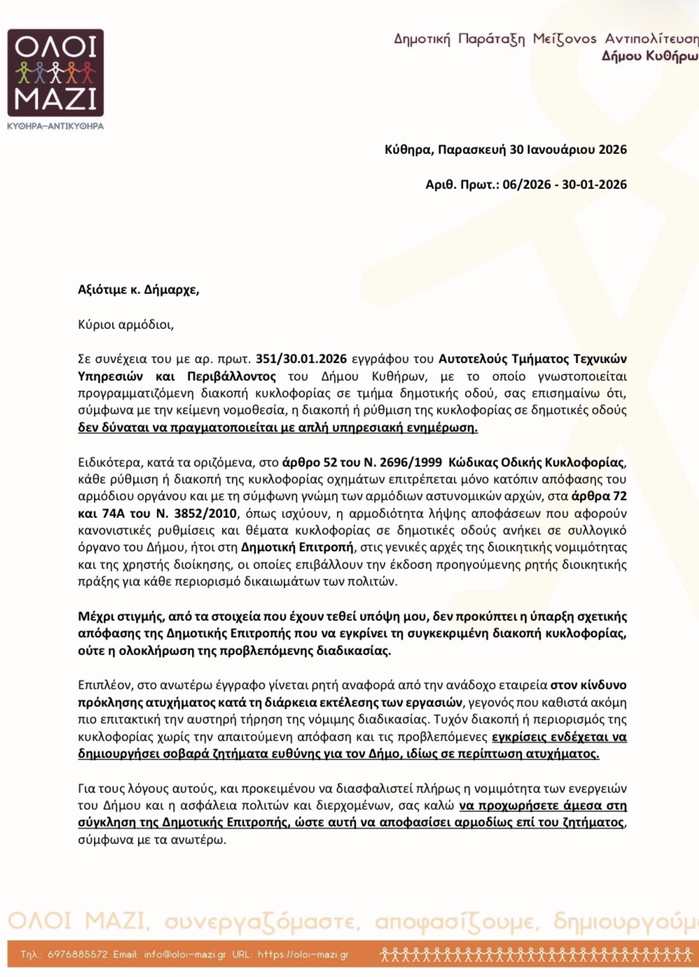 Σας διαβιβάζω το συνημμένο έγγραφο, το οποίο αφορά την τήρηση της προβλεπόμενης από τη νομοθεσία διαδικασίας για τη ρύθμιση ή διακοπή της κυκλοφορίας σε δημοτικές οδούς, σύμφωνα με τις διατάξεις του Κώδικα Οδικής Κυκλοφορίας και το ισχύον θεσμικό πλαίσιο.