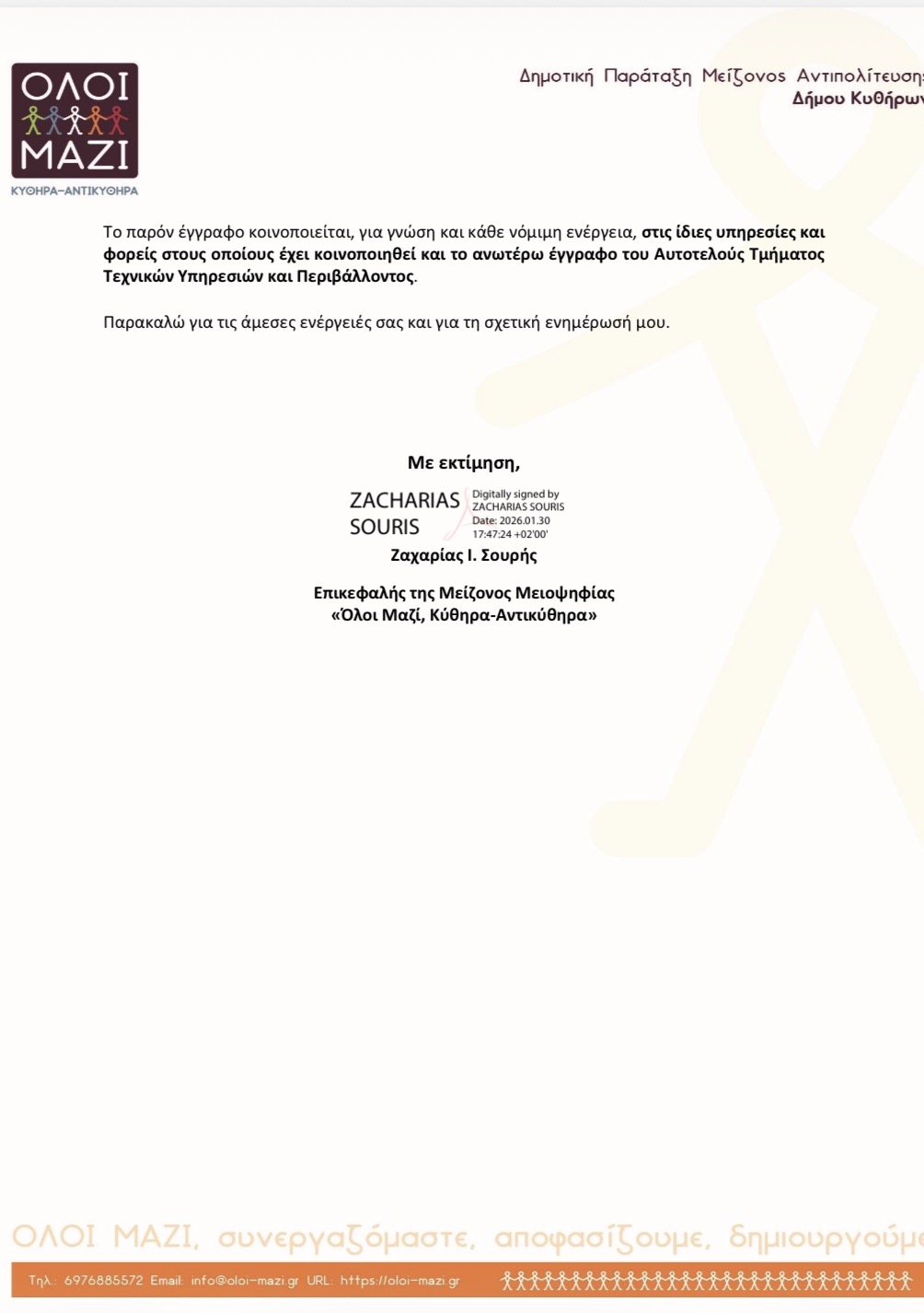 Σκοπός της ενημέρωσης αυτής είναι η διασφάλιση της νομιμότητας των ενεργειών του Δήμου και η αποφυγή ζητημάτων ευθύνης, με γνώμονα την προστασία των πολιτών και την εύρυθμη λειτουργία των θεσμικών οργάνων.