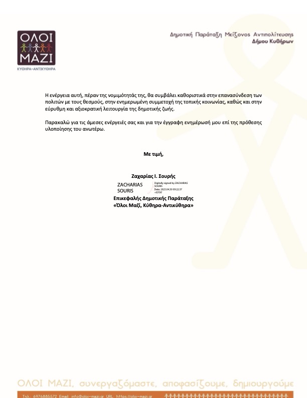 Διαβίβαση επιστολής του κ. Ζαχαρία Σουρή με θέμα: «Αίτημα για μόνιμη και θεσμική ενεργοποίηση της ζωντανής μετάδοσης των συνεδριάσεων του Δημοτικού Συμβουλίου», η οποία αφορά στη διαφάνεια, την πρόσβαση των πολιτών στη διαδικασία λήψης αποφάσεων και την ενίσχυση της δημόσιας πληροφόρησης.