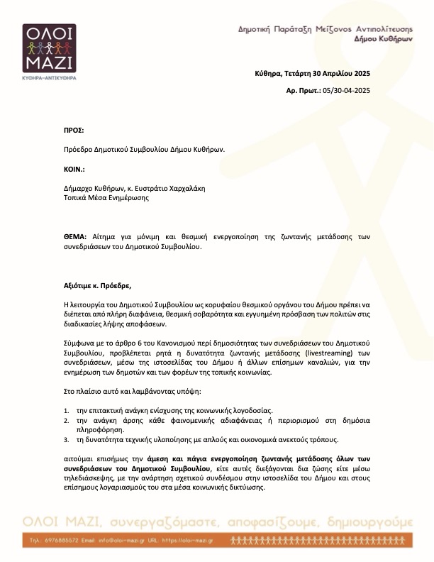 Διαβίβαση επιστολής του κ. Ζαχαρία Σουρή με θέμα: «Αίτημα για μόνιμη και θεσμική ενεργοποίηση της ζωντανής μετάδοσης των συνεδριάσεων του Δημοτικού Συμβουλίου», η οποία αφορά στη διαφάνεια, την πρόσβαση των πολιτών στη διαδικασία λήψης αποφάσεων και την ενίσχυση της δημόσιας πληροφόρησης.
