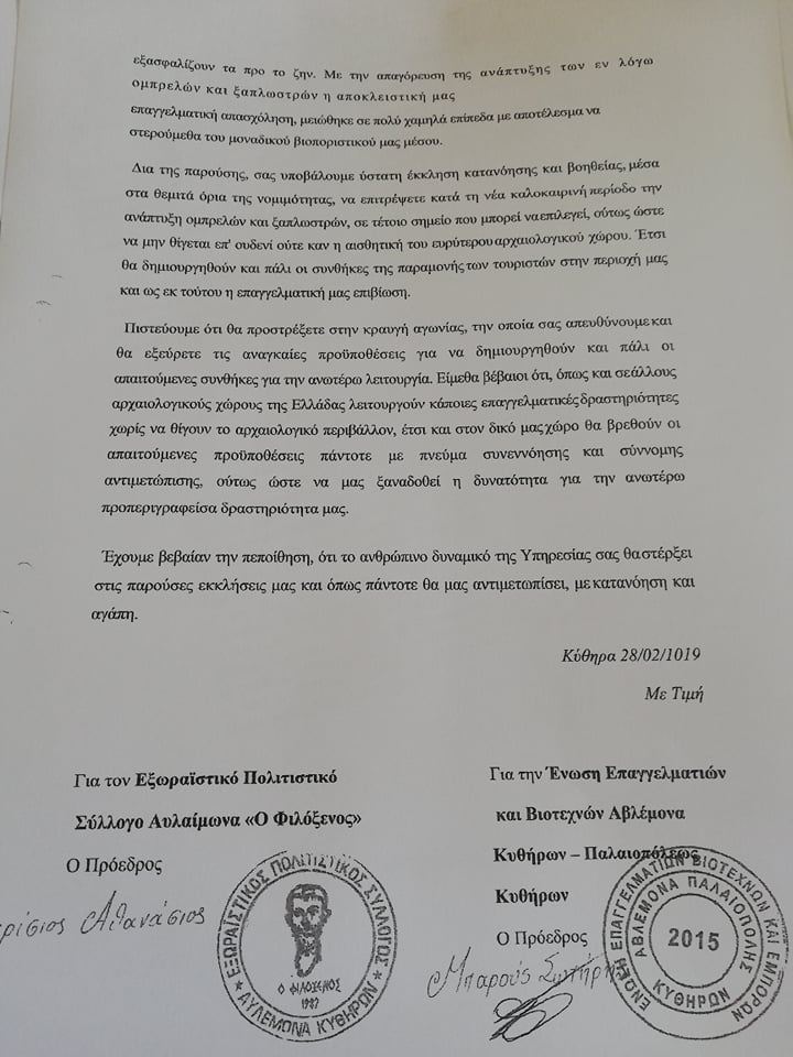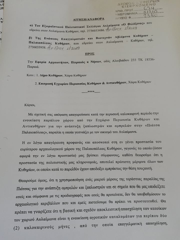 Αναρτήθηκε στη Διαύγεια από την Επιτροπή Εγχωρίου Περιουσίας Κυθήρων και Αντικυθήρων η διακήρυξη μίσθωσης για την τοποθέτηση καντίνας και ομπρελών στην παραλία «Πιάτσα» Παλαιοπόλεως για το έτος 2020 που θα γίνει στις 29 Μαΐου (ο λόγος της μονοετούς μισθώσεως είναι ότι την άνοιξη του 2021 θα διενεργηθεί ο διαγωνισμός για όλες τις παραλίες του νησιού συνολικά). Όπως είναι γνωστό, το 2017, μετά από καταγγελίες ιδιωτών προς την Αρχαιολογία, απαγορεύθηκε η μίσθωση των παραλιών της Παλαιοπόλεως, παρά το γεγονός ότι αυτή γινόταν επί πολλά χρόνια.
