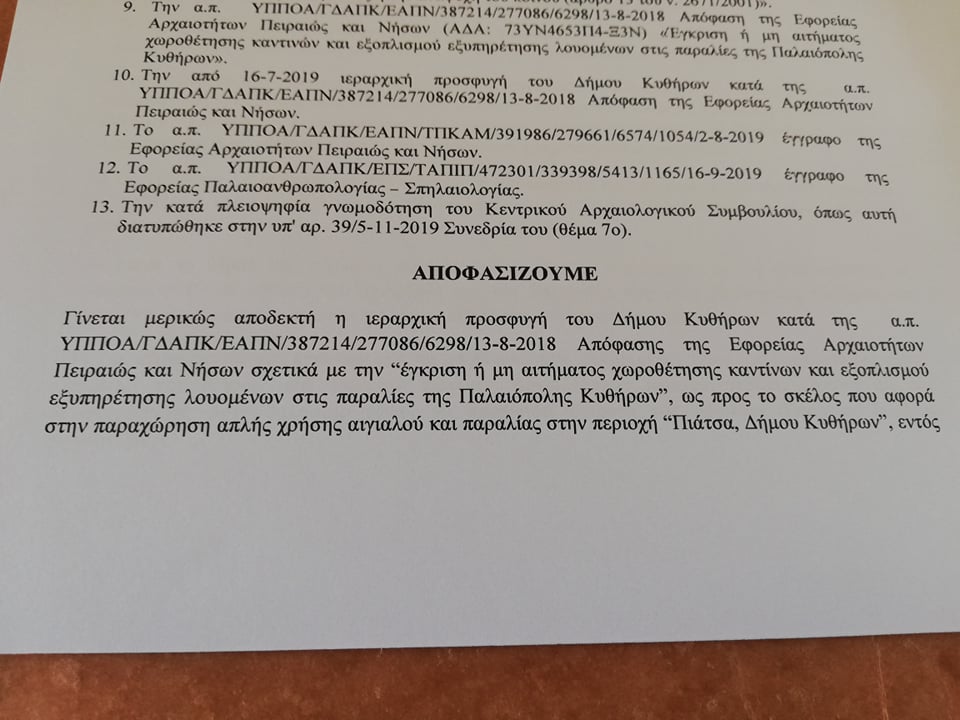 Η υπόθεση έφτασε στο Κεντρικό Αρχαιολογικό Συμβούλιο (ΚΑΣ) το οποίο έδωσε τελικά θετική γνωμοδότηση δυνάμει της οποίας εκδόθηκε η 5838/16-12-2019 απόφαση της Υπουργού Πολιτισμού και Αθλητισμού κας. Λίνας Μενδώνη με βάση την οποία εγκρίθηκε η τοποθέτηση καντίνας και ομπρελών-ξαπλωστρών στην Πιάτσα Παλαιοπόλεως. Για την λήψη της συγκεκριμένης απόφασης από το αρμόδιο Υπουργείο, προηγήθηκε συστηματική και πολύμηνη δουλειά του Δήμου και προσωπικά δική μου, υποβλήθηκε τεκμηριωμένη Ιεραρχική Προσφυγή καθώς και σειρά σχετικών αιτημάτων του Προέδρου της Κοινότητας Μητάτων, των Συλλόγων, των κατοίκων και των επαγγελματιών του Αβλέμωνα, για τους οποίους η μίσθωση της παραλίας Παλαιοπόλεως είναι ζωτικής σημασίας.