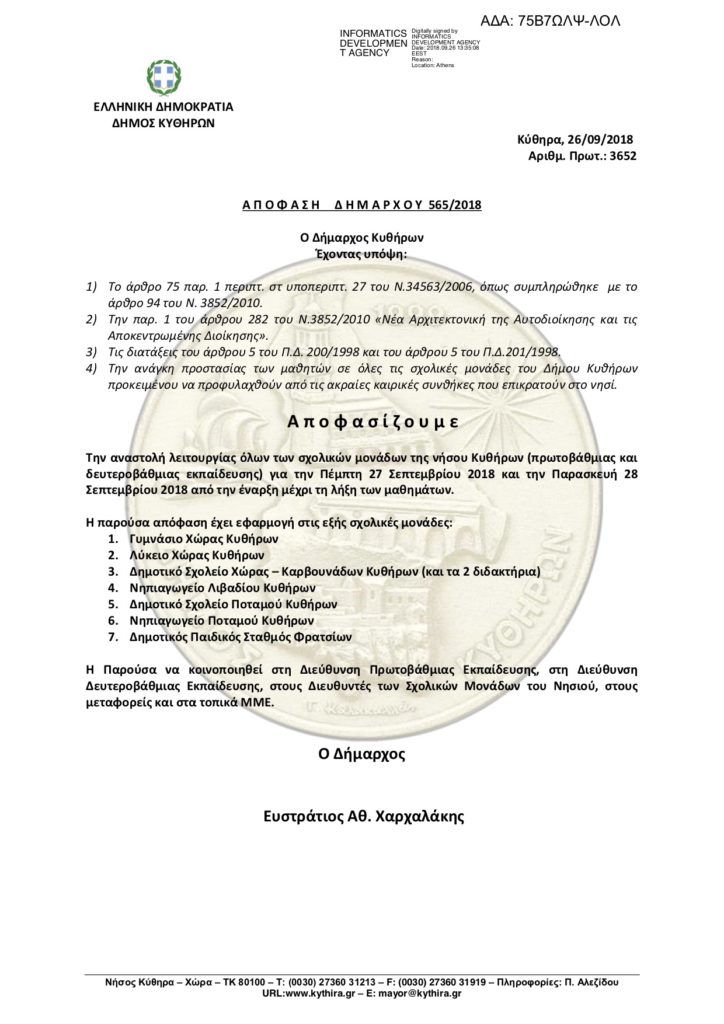 - Δήμαρχος Κυθήρων – Αναστολή λειτουργίας σχολικών μονάδων Κυθήρων