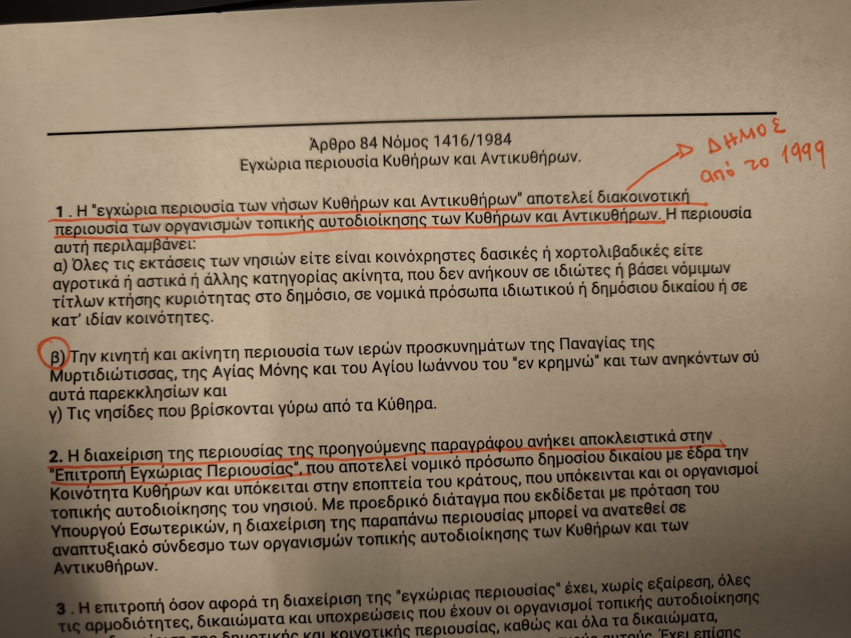 Θυμίζουμε πάντως στον Σεβασμιώτατο, ότι το Π.Δ. για την Εγχώριο είναι σαφέστατο για το ρόλο του Δήμου σε περίπτωση που η ίδια η Εγχώριος και ο Δήμος συναποφασίσουν τη μεταβίβαση της περιουσίας και μάλιστα με ΡΗΤΗ αναφορά στα Ιερά Προσκυνήματα (άρ. 17): «1. Η μεταβίβαση του συνόλου της εγχώριας περιουσίας στο Δήμο Κυθήρων επιτρέπεται μετά από απόφαση της Επιτροπής, η οποία εγκρίνεται από το Δήμο Κυθήρων και από το Συντονιστή της Αποκεντρωμένης Διοίκησης και δημοσιεύεται στην Εφημερίδα της Κυβερνήσεως. Στην απόφαση ορίζεται ότι ο Δήμος Κυθήρων αναλαμβάνει τη διοίκηση και διαχείριση και της περιουσίας των Ιερών Προσκυνημάτων του άρθρου 84 παρ. 1 β του ν. 1416/1984».