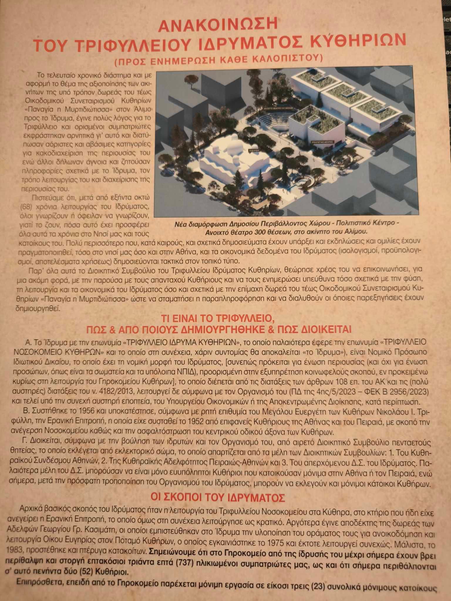 3. Η παραπληροφόρηση σχετικά με τις αληθινές διαστάσεις του ζητήματος – δυστυχώς και από θεσμικούς εκπροσώπους που δε νομιμοποιούνται να ενεργούν αφρόνως, υστερόβουλα ή παρορμητικά – έχει δημιουργήσει μια απαράδεκτη δημόσια συζήτηση που αφήνει υπονοούμενα ακόμα και για την εντιμότητα της διοίκησης του Τριφυλλείου, που είναι εγνωσμένη και δεν τίθεται υπό διαπραγμάτευση. Παράλληλα, έχουν δημοσιευθεί ψευδέστατες και παραπλανητικές “φωτογραφίες” με ογκωδέστατα κτίρια 8 και 10 ορόφων (!) σε μια προσπάθεια ορισμένων να κατευθύνουν τεχνηέντως την τοπική κοινωνία εναντίον της αντιπαροχής του ακινήτου, ενώ η πραγματικότητα είναι ότι θα χτιστούν 3 διώροφα κτίρια και 1 τριώροφο, το οποίο θα στεγάσει το Πνευματικό Κέντρο και τα γραφεία του Εξωραϊστικού Συλλόγου Κυθηρίων. Δηλαδή θα τηρηθεί πλήρως η ισχύουσα πολεοδομική νομοθεσία της περιοχής, ενώ η ανάδοχος εταιρεία ΔΑΚΩΝ παραιτείται ακόμα και του δικαιώματος bonus καθ΄ ύψος, για το οποίο ορθά ο Δήμος Αλίμου προσέφυγε στο ΣτΕ. Επιπλέον, θα γίνει ένα μεγάλο ανοικτό θέατρο και μια συνολική ανάπλαση του οικοπέδου, όπως παρουσιάστηκε σε φωτορεαλιστική απεικόνιση στο εξαιρετικό ενημερωτικό φυλλάδιο που εξέδωσε το Ίδρυμα. Κανένα περιθώριο παρερμηνείας λοιπόν. Καμία τσιμεντοποίηση, καμία υποβάθμιση της περιοχής! Ακριβώς το αντίθετο!