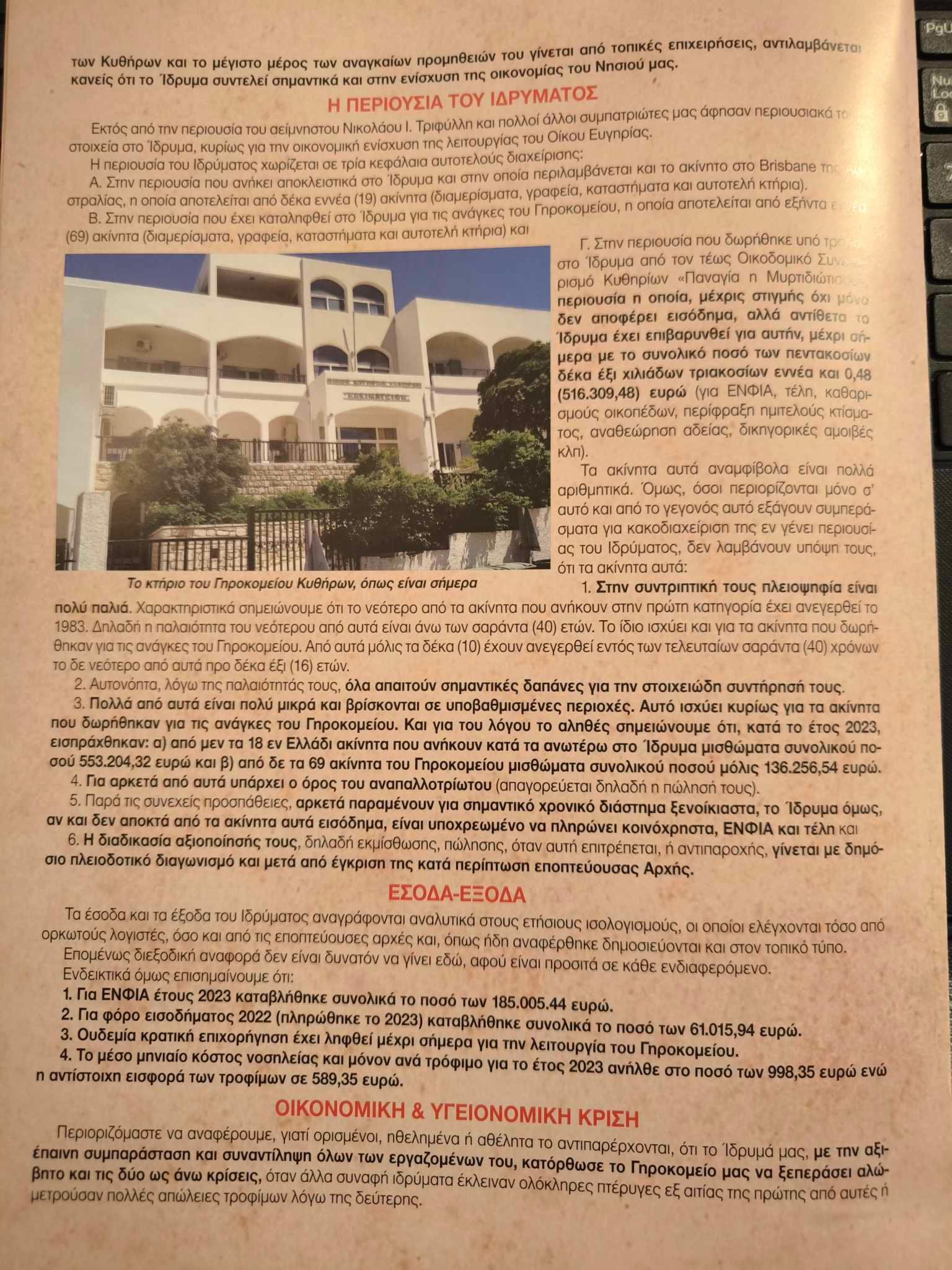 4. Η πρόσφατη απόφαση του ΚΕΣΥΠΟΘΑ δικαιώνει απόλυτα το Ίδρυμα, το οποίο μέχρι σήμερα ουδέποτε έχει κινηθεί δικαστικά έναντι ουδενός, αλλά μόνο αμύνεται απέναντι σε νομικές ενέργειες που θέτουν σε τεράστιο κίνδυνο μια νομιμότατη διαδικασία και κατ΄ επέκταση τη λειτουργία του Γηροκομείου Κυθήρων, το οποίο θα χρηματοδοτηθεί επαρκώς από την πρόταση αξιοποίησης.