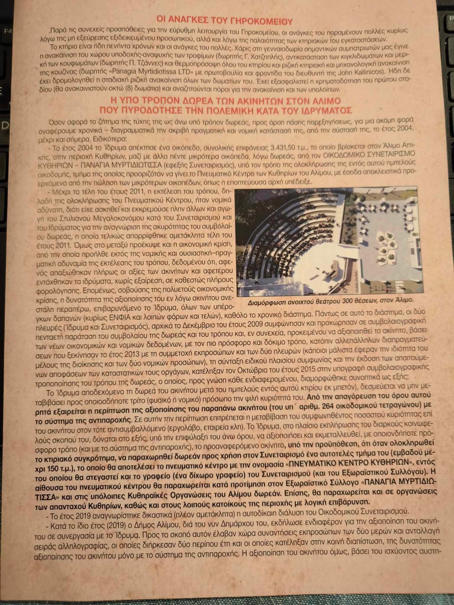 2. Η ανάλυση του ζητήματος από τον Πρόεδρο του Ιδρύματος Δρα. Εμμ. Καλοκαιρινό και τους εξαίρετους νομικούς Πέτρο Κασιμάτη και Γαβρίλη Νικηφοράκη, δεν αφήνει κανένα περιθώριο παρερμηνείας ή παρεξήγησης. Το Ίδρυμα υπόκειται σε αυστηρότατο έλεγχο από το Υπουργείο Οικονομικών και εφαρμόζει υποχρεωτικά το νόμο 4182/2013 περί κοινωφελών περιουσιών, ο οποίος κάμπτει κάθε άλλη γενική διάταξη. Η διαδικασία υλοποίησης της υπό τρόπον δωρεάς καλύπτει απόλυτα τη βούληση του διαθέτη, είναι σύμφωνη με το νόμο και έχει την έγκριση των αρμοδίων υπηρεσιών, συνεπώς κάθε πράξη, ενέργεια ή παράλειψη προς το αντίθετο θα οδηγήσει με απόλυτη βεβαιότητα τη Διοίκηση του Ιδρύματος σε ποινική δίκη για παράβαση καθήκοντος και μάλιστα σε κακουργηματικό βαθμό.