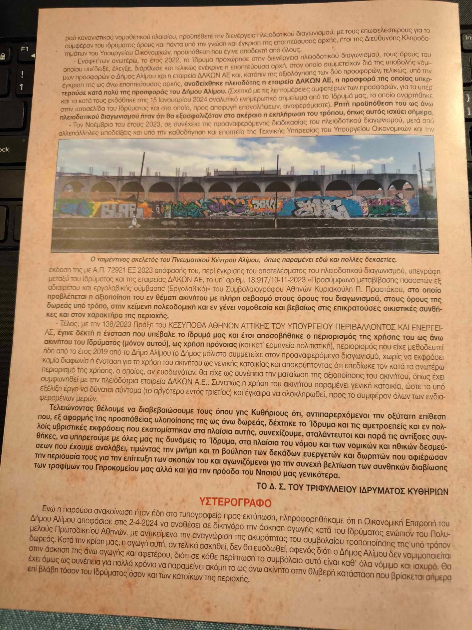 1. Το ζήτημα έχει ιδιάζουσες νομικές και τεχνικές προεκτάσεις και είναι ανεπίτρεπτο να εκφράζουν δημόσια άποψη για αυτό όσοι δεν τις γνωρίζουν επαρκώς, γιατί συμβάλλουν (άθελά τους ή όχι) στη λανθασμένη πληροφόρηση του κοινού. Προσωπικά γνωρίζω επαρκώς όλα τα σχετικά ζητήματα, τόσο λόγω της παλαιόθεν σχέσης μου με την κυθηραϊκή παροικία του Αλίμου, όσο και λόγω της διαρκούς συνεργασίας μου με το Τριφύλλειο Ίδρυμα.