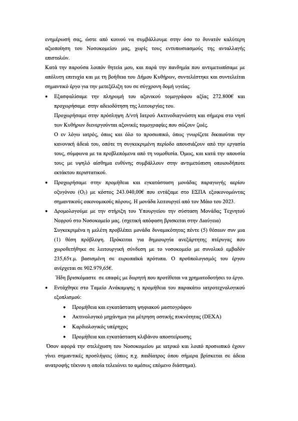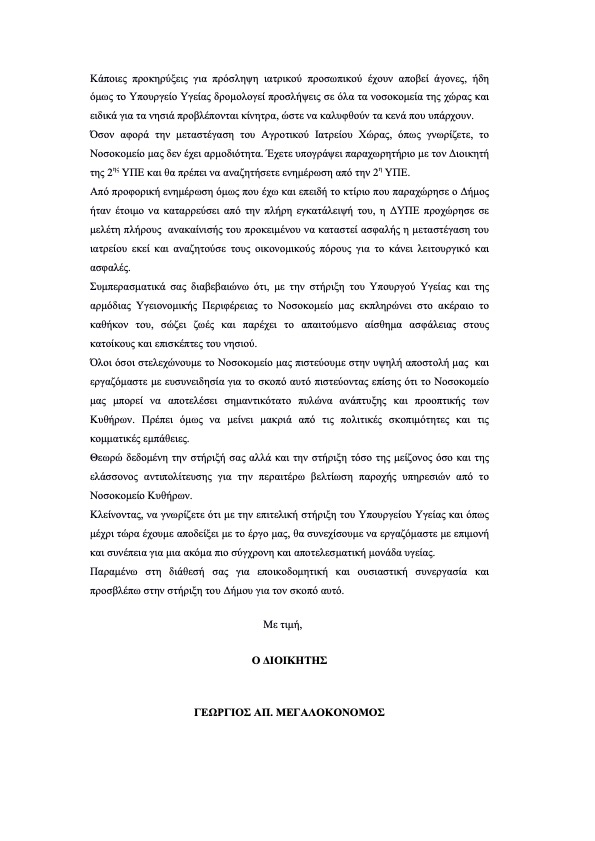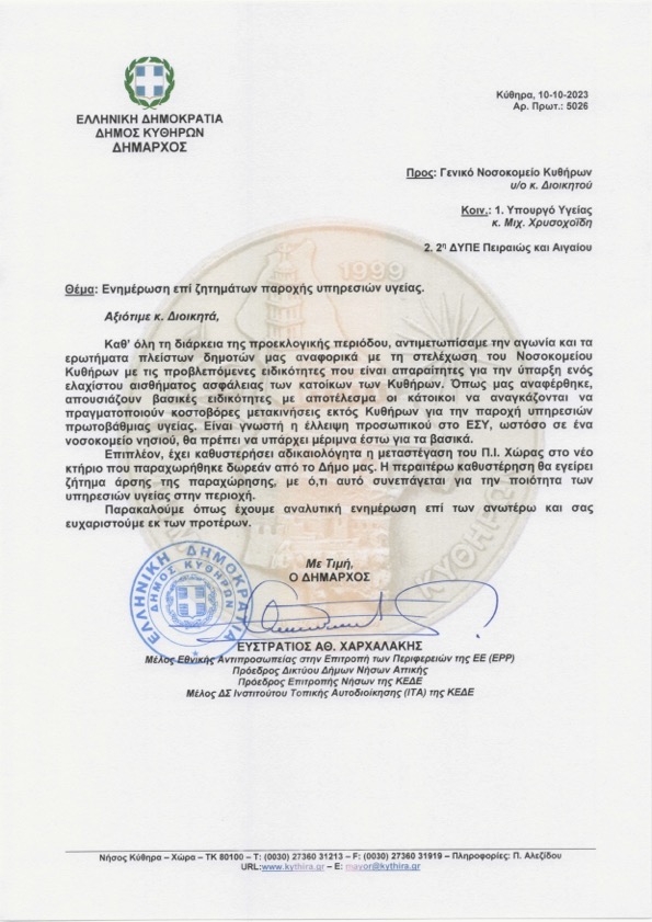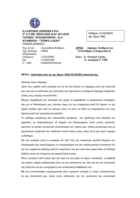 Δημόσια ανταλλαγή επιστολών Δημάρχου – Διοικητή για το Νοσοκομείο Κυθήρων