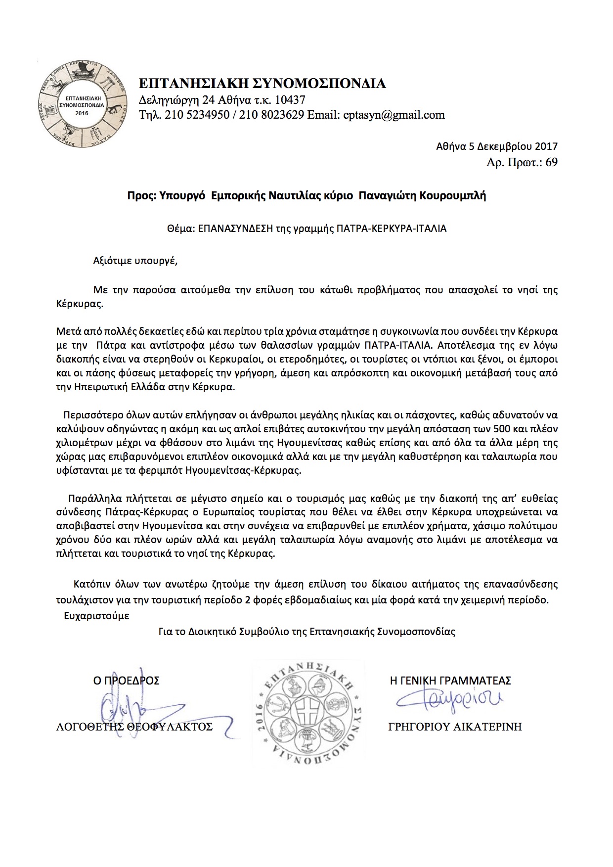 Επιστολή προς Υπουργείο Ναυτιλίας