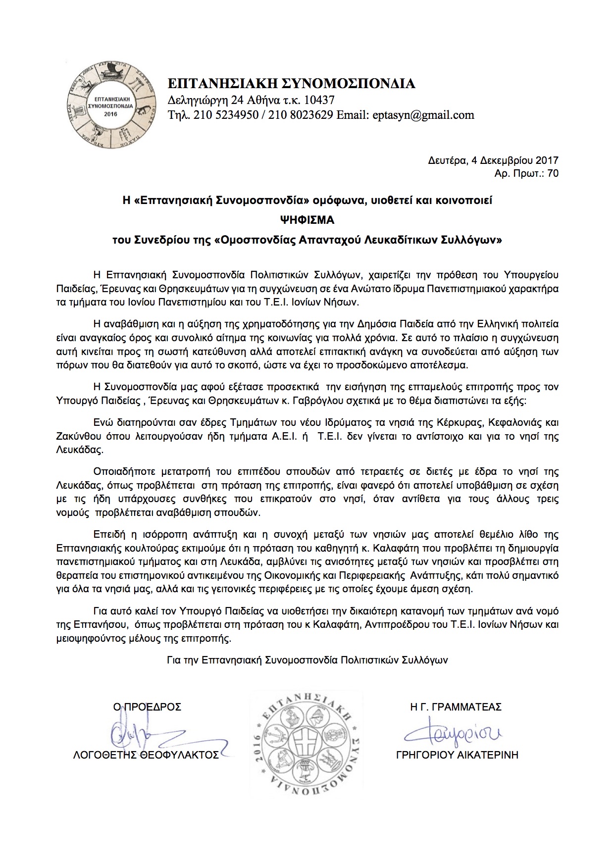 Ψήφισμα προς Υπουργείο Παιδείας