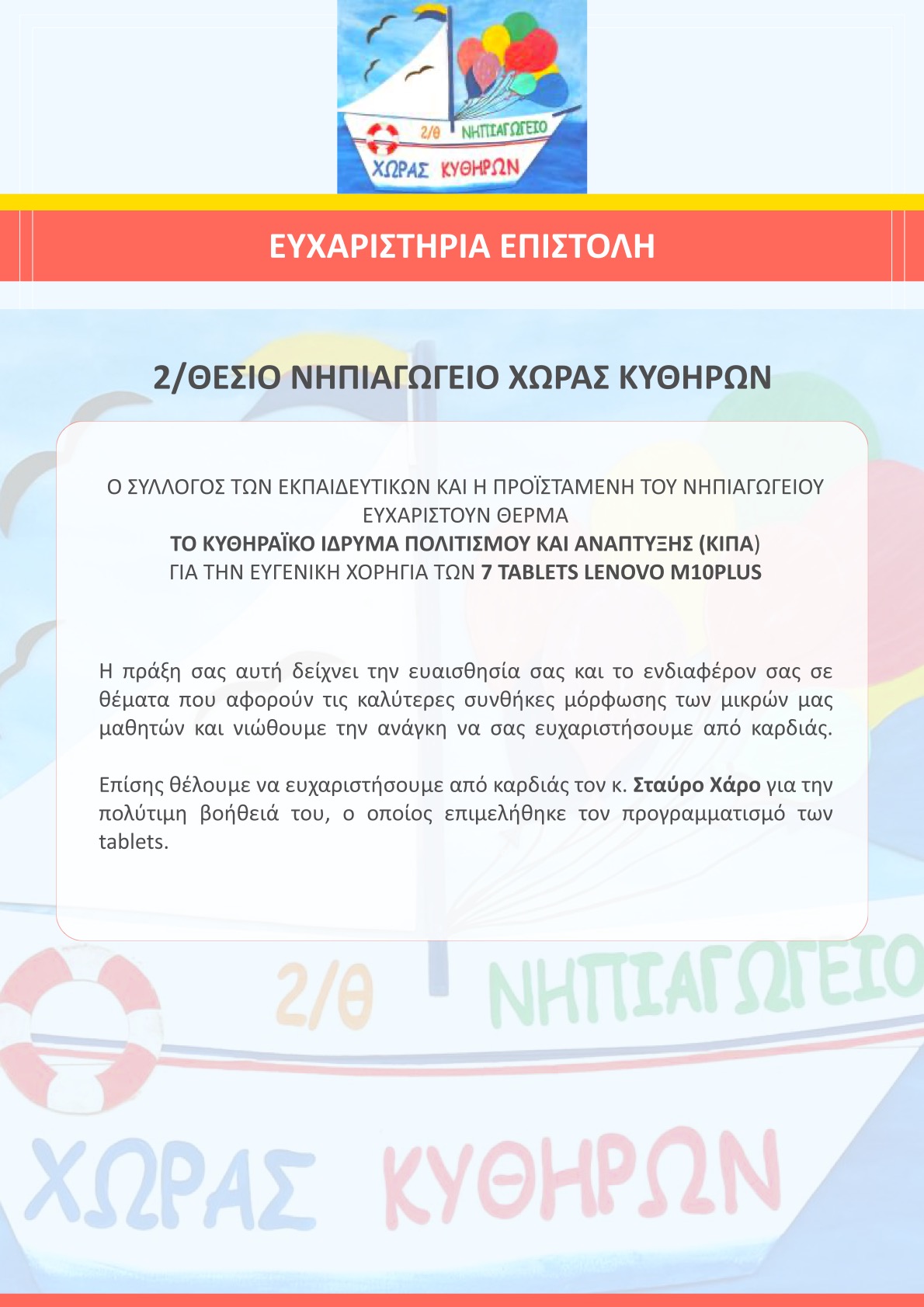 - Δημοσίευση Ευχαριστήριας επιστολής από το Νηπιαγωγείο Χώρας προς το ΚΙΠΑ
