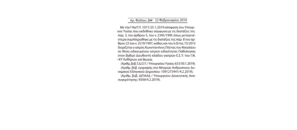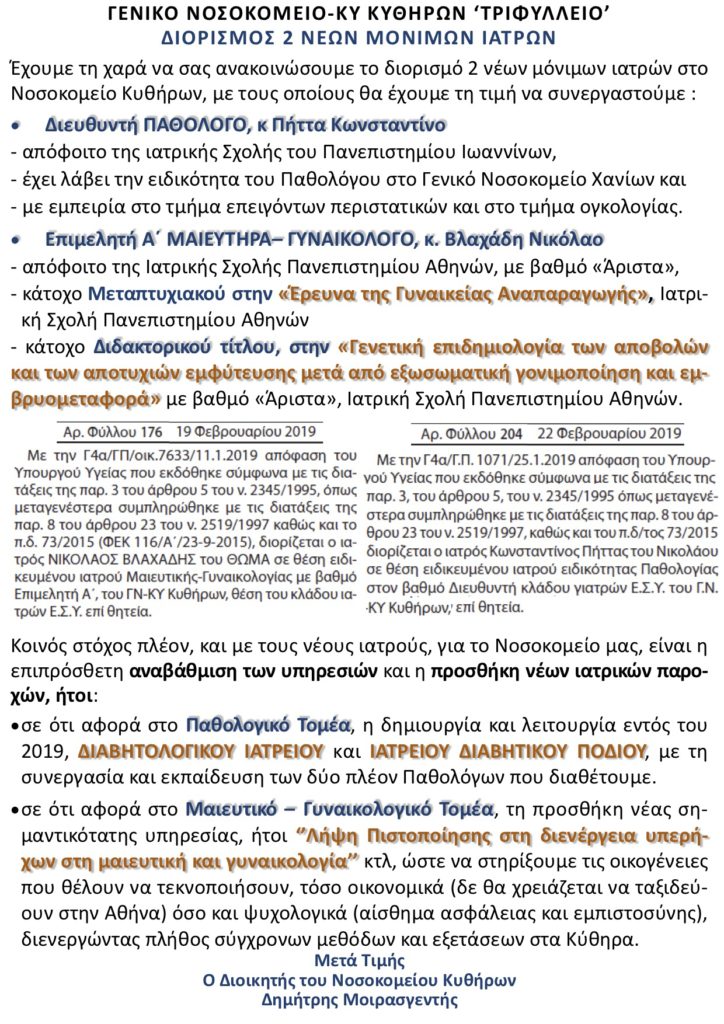 Διορισμός 2 νέων μόνιμων ιατρών στο Νοσοκομείο Κυθήρων, Παθολόγου και Μαιευτήρα